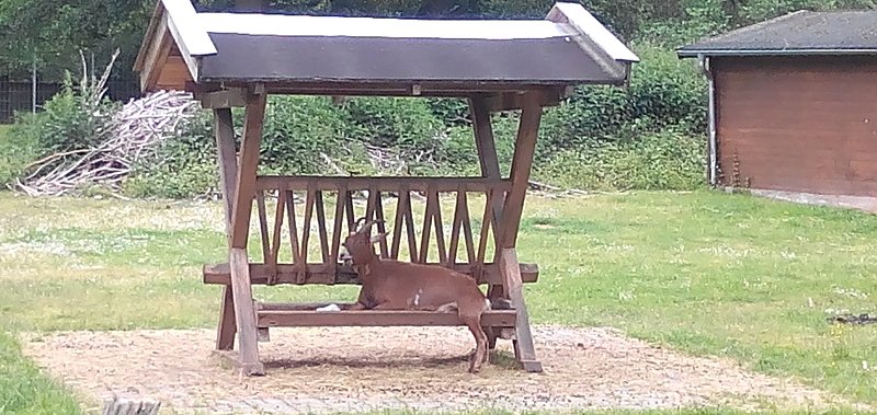 Überwiegend sind es die Normalitäten, denen man zwischen Parkallee und Van-der-Foehr-Damm begegnet, doch ab und zu gibt es auch die Kuriositäten. Wie diese Ziege hier, die sich eine Futterraufe als Ruheplatz auserkoren hatte.