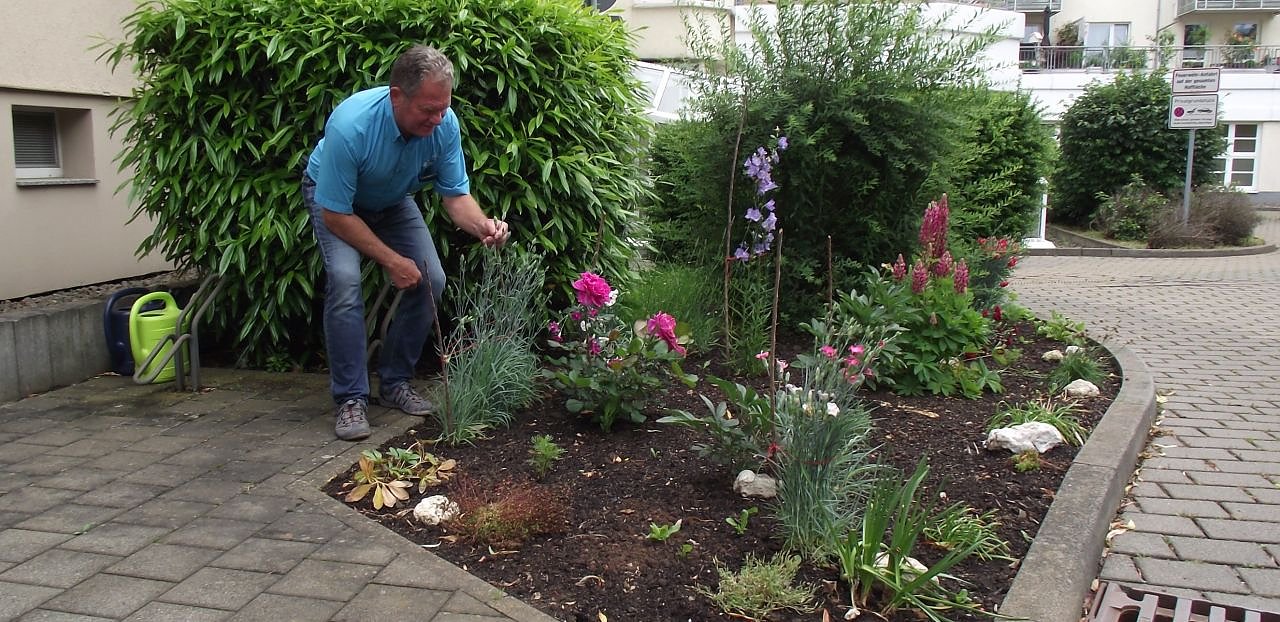 Wir sind auf Tour. Mit Detlef Helbing, Teamleiter Objektmanager des Großvermieters. Ein zugänglicher, sympathischer Mann. Die Fahrt führt in die Spiegelstraße 25. Hier pflegt Jutta Schulze eine Rabatte gleich neben dem Balkon. Sie hegt jede Blume, jedes Gewächs. Alles, was sie in den Boden setzte, ist ihr heilig.