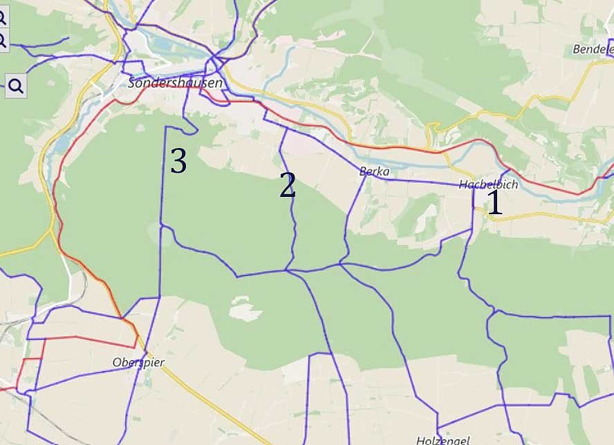 Wer aus Richtung Bad Frankenhausen auf dem UWR kommt, kann in Hachelbich durch den Ort fahren (Bahnhofstraße, Weibachstraße, Hauptstraße, Berkaer Weg und Schneidstraße), Ausschilderung des Radwegs RuS (Rund um Sondershausen) folgen und durch das Klappental bis hoch zum Possen fahren. Ist auch nicht viel steiler als die Possenauffahrt.