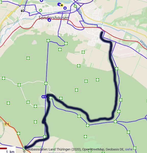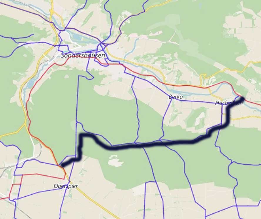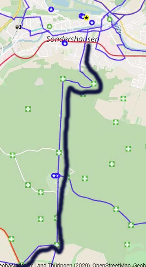 Die rote Linie in der Karte markiert den Unstrut-Werra-Radweg (UWR), wie er sich durch Sondershausen schlängelt.