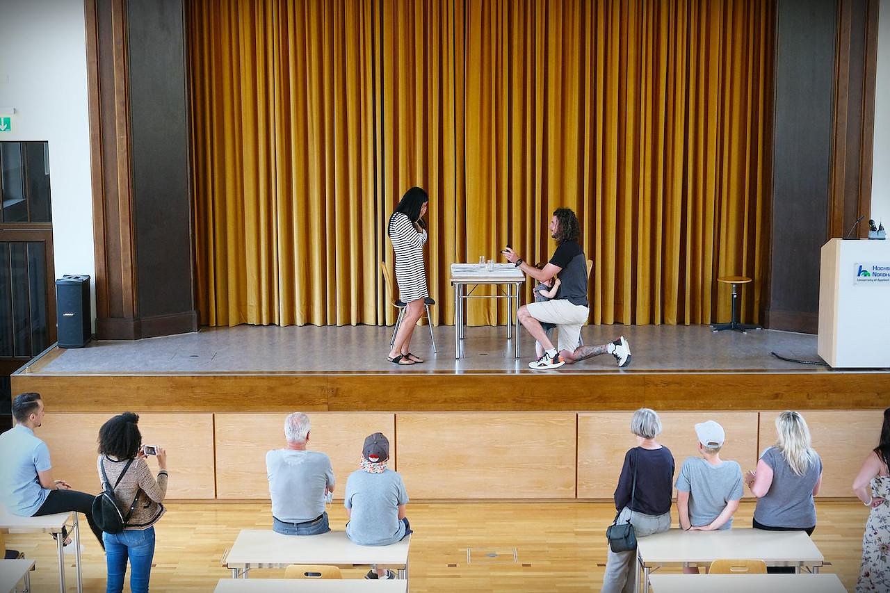 Entsprechend groß war die Überraschung als sich Janine Klostermann nicht in einem Restaurant, sondern an ihrer Hochschule wiederfand. Hier bekam sie symbolisch einen Tisch gedeckt und zwar von Freunden, Verwandten und sogar ihrer kleinen Tochter.