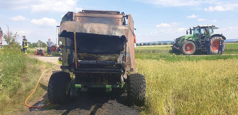 Hier brannte eine Strohpresse. Nach ersten Informationen geht die Polizei von einem technischen Defekt aus.