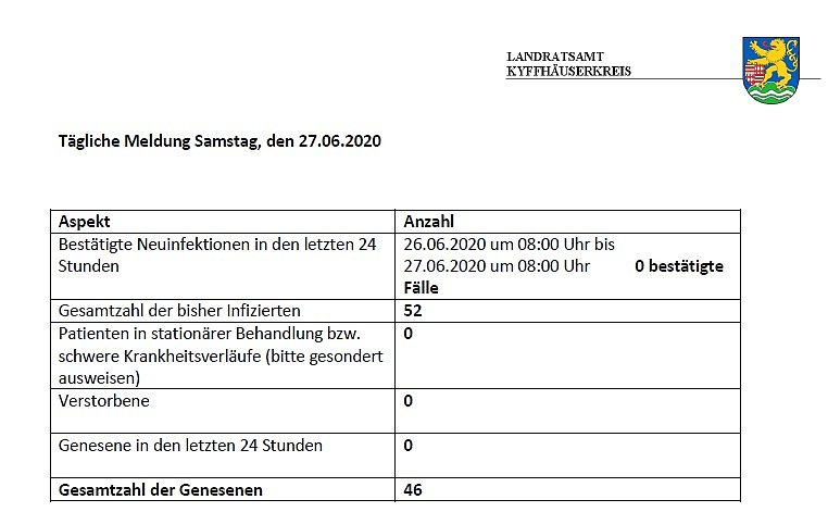 Meldungen aus dem Landratsamt Kein neuer Fall gemeldet Hier die tägliche Meldung zu Corona aus dem Landratsamt Kyffhäuserkreis... Kein neuer Fall gemeldet (Foto: Landratsamt Kyffhäuserkreis)