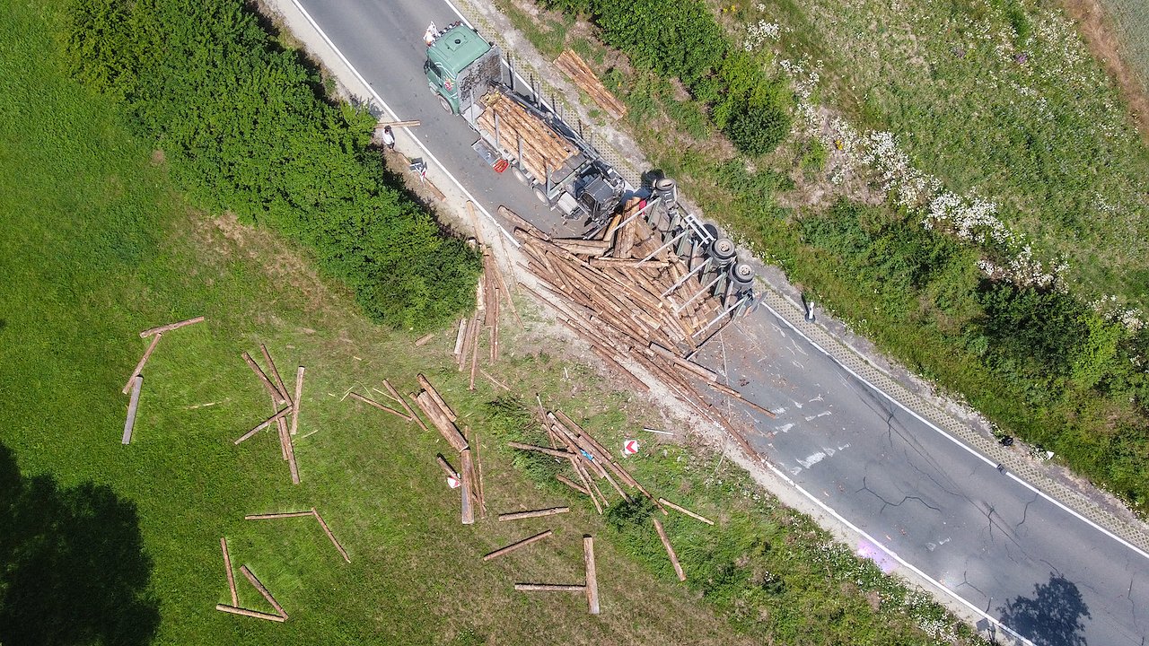 Anhänger mit Baumstämmen kippt auf die Straße