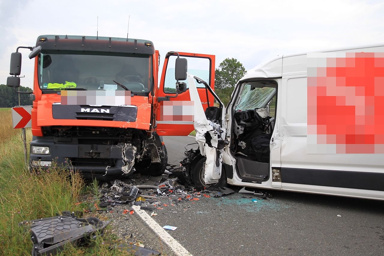 Dort kam es zur Kollision mit dem entgegenkommenden Lkw eines 53-Jährigen. Der Transporter Fahrer wurde im Fahrzeug eingeklemmt. Er und sein Beifahrer kamen mit schweren Verletzungen ins Krankenhaus. Der Lkw-Fahrer erlitt einen Schock. Beide Fahrzeuge mussten abgeschleppt werden.