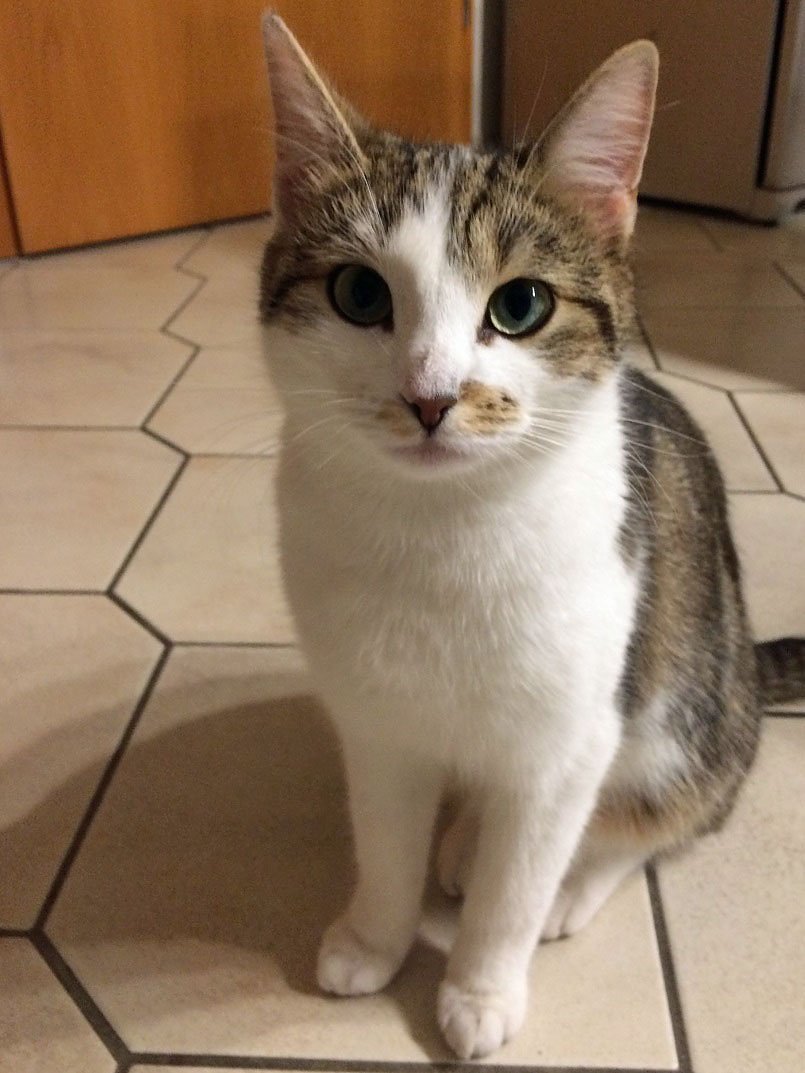 Sie ist eine kleine Katze mit weißem Bauch/Beinen und grau getigertem Rücken/Schwanz. Ihre Besonderheit ist ein kleiner brauner Fleck neben der Nase und eine V-förmige weiße Spitze auf dem Köpfchen. Sie ist sehr zutraulich, neugierig und lieb.
