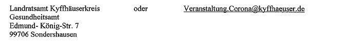 Zur Kenntnis übersenden wir Ihnen im Zuge der Neuerungen der Corona-Verordnungen das Rundschreiben des Landratsamtes zur Beantragung einer Dauererlaubnis für die Durchführung einer öffentlichen Sportveranstaltung mit Zuschauern, mit dem zugehörigen Antragsformular für die Sportvereine im Kyffhäuserkreis.