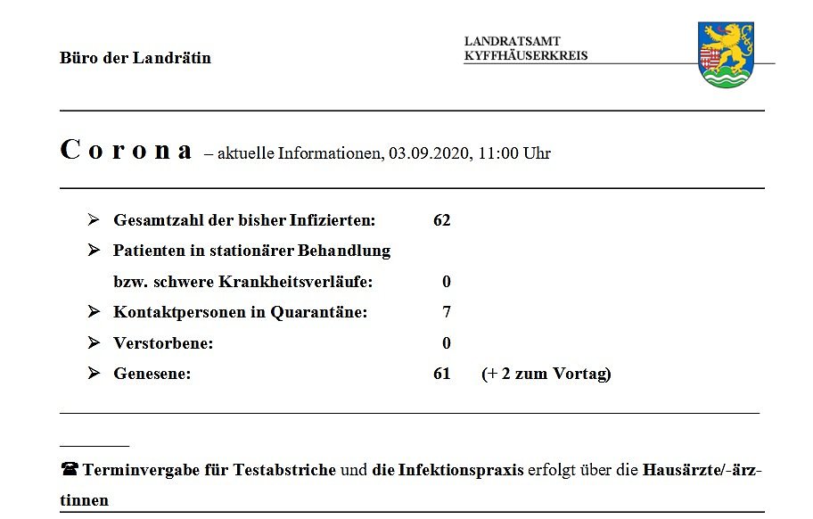 Hier die tägliche Corona-Meldung aus dem Landratsamt Kyffhäuserkreis...