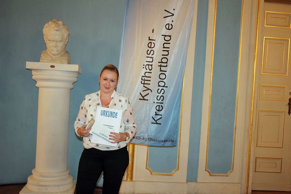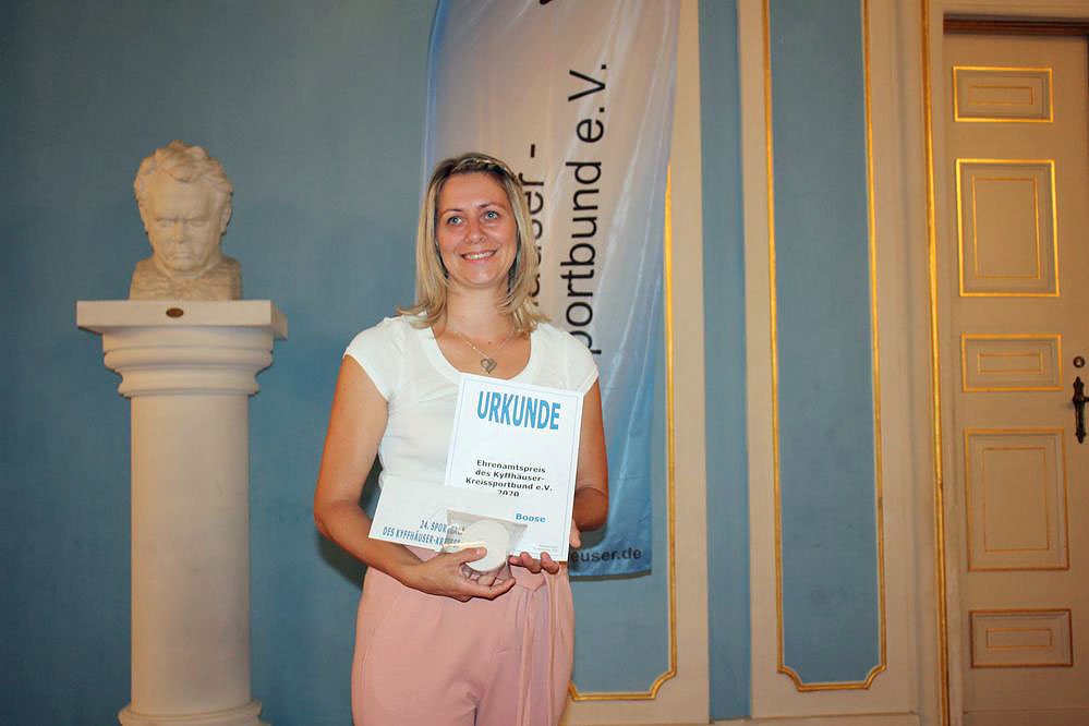 Sie ist Übungsleiterin, Betreuerin, Organisatorin im Kinderbereich Turnen seit 5 Jahren. Sie leitet Training u. Wettkämpfe der AK 7 und jünger und macht die Orga der Vereinsturniere. Sie hat eine Sporthelfer-Lizenz seit Herbst 2019 und leistet ehrenamtl. Arbeit am Pferdehof Jungermann Schultz in Wollersleben und im Jugend-Rot-Kreuz.