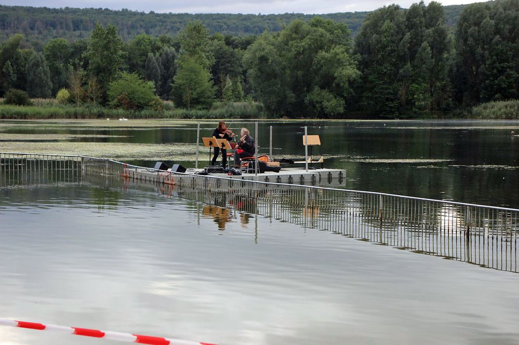 Dann folgte der Konzertteil mit "moderner" Musik. Und gleich zwei Mal gab es einen kleinen Schreck. Trotz zeitweiser lockerer Bewölkung mit Sonnenschein kamen kurzzeitig einige Regentropfen vom Himmel und dem Duo mit Geigerin Katrin Deichstetter mit Ihrer Violine und Gitarren-Virtuose Klaus-Dieter Weigert wehte der Wind die Notenblätter vom Ständer und eines landte gar im Wasser, konnte aber "gerettet" werden. Zu dem Zeitpunkt brachte kn gerade die Kamera wieder in Ordnung.
