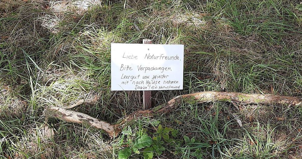 Und Zeitgenossen machen sich Gedanken um die Sauberkeit im Wald. Hoffentlich muss es nicht Mode werden, dass neben einer Bank immer so ein Schild stehen muss.