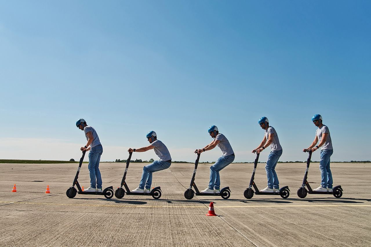 Der Bremsweg lässt sich durch Position und Haltung auf dem E-Scooter beeinflussen und kontrollieren. Die ADAC Experten empfehlen, sich am besten so weit hinten wie möglich auf das Trittbrett zu stellen und die Knie leicht zu beugen, das erleichtert Balance und Reaktionsvermögen und verlagert den Schwerpunkt nach hinten und nach unten. So kann eine höhere Verzögerung erreicht werden, ohne dass ein Überschlag droht. Um den E-Scooter möglichst schnell anzuhalten, sollte man die Vorderradbremse so kräftig ziehen, dass das Hinterrad gerade nicht abhebt. Die Hinterradbremse kann auf ebener und gerade verlaufender Bremsstrecke notfalls bis zum Radblockieren betätigt werden.