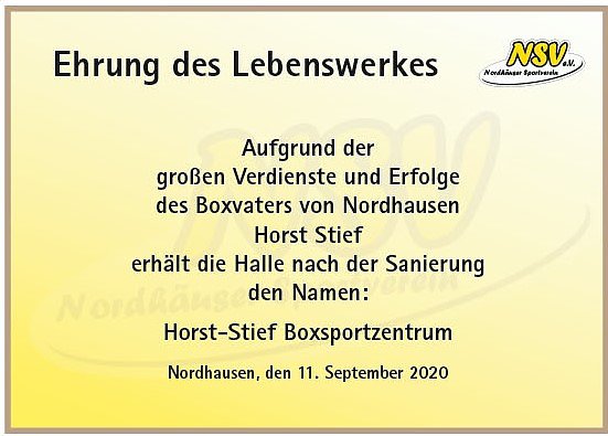 Der Nordhäuser Boxvater Horst Stief war persönlich anwesend und rang nach Worten, nachdem die Namenstafel enthüllt wurde und der minutenlange Beifall verstummte. Ein sichtlich berührter Horst Stief hatte mit dieser Ehre nicht gerechnet.