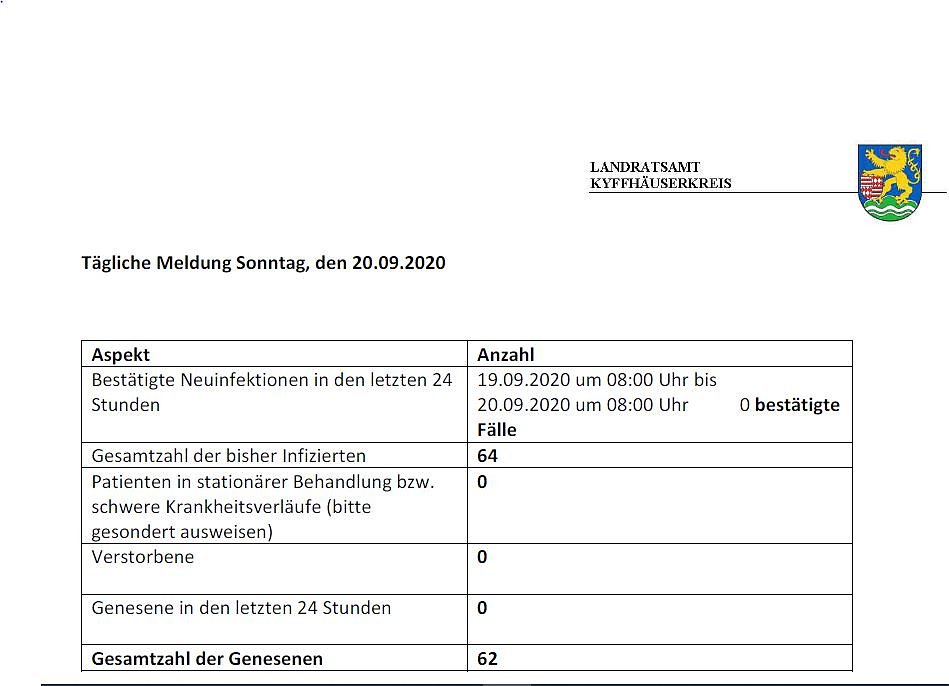 Hier die tägliche Corona-Meldung aus dem Landratsamt Kyffhäuserkreis...