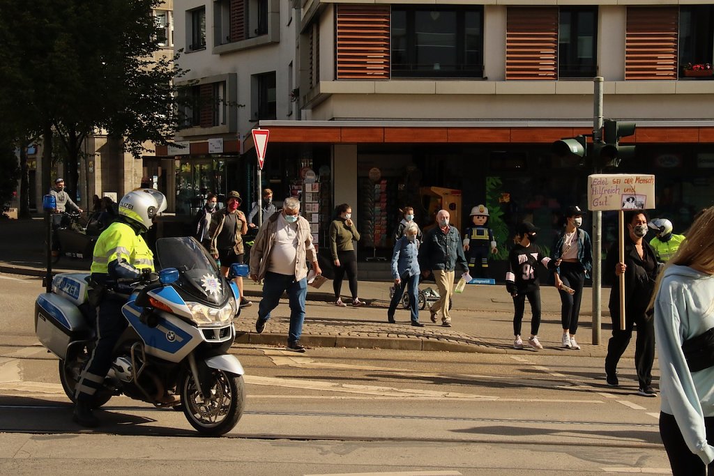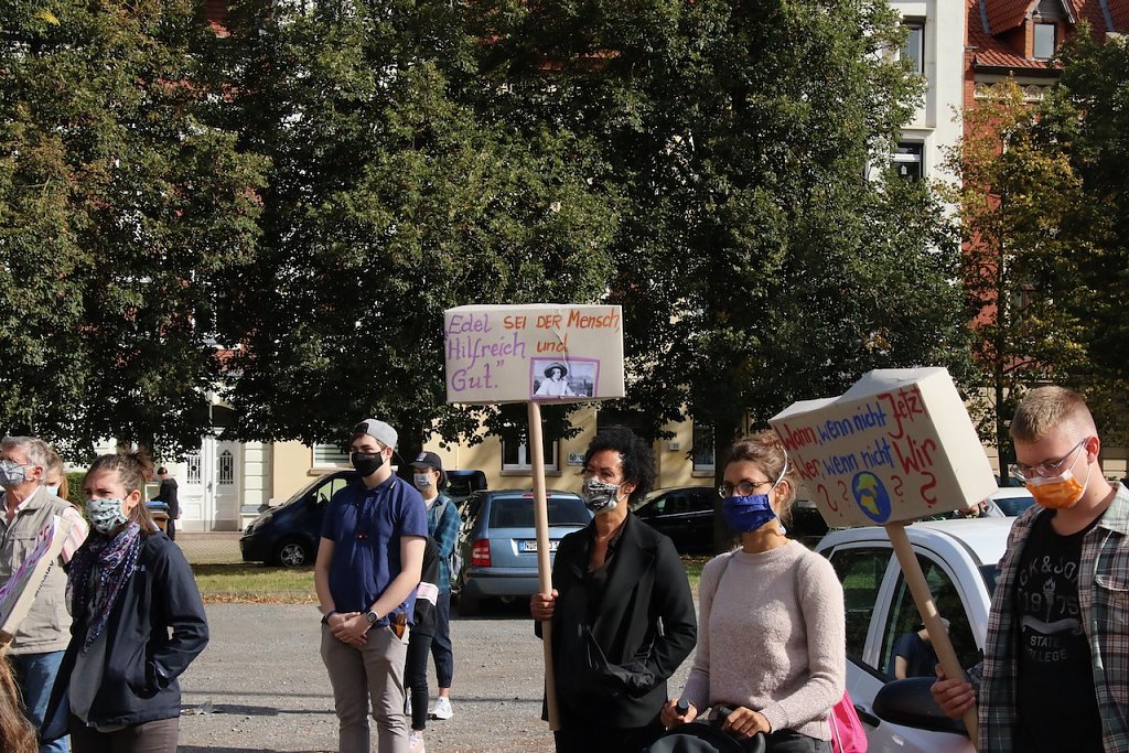 Vom August-Bebel-Platz ging es weiter in Richtung Rathaus. Im Demonstrationszug gab man sich Mühe, die Abstandsregeln auch auf dem Weg dahin einzuhalten, mit gemischten Erfolg. An fester Stelle war das schon einfacher, Mund- und Nasenschutz waren verpflichtend, woran sich die Teilnehmer durchgehend hielten.