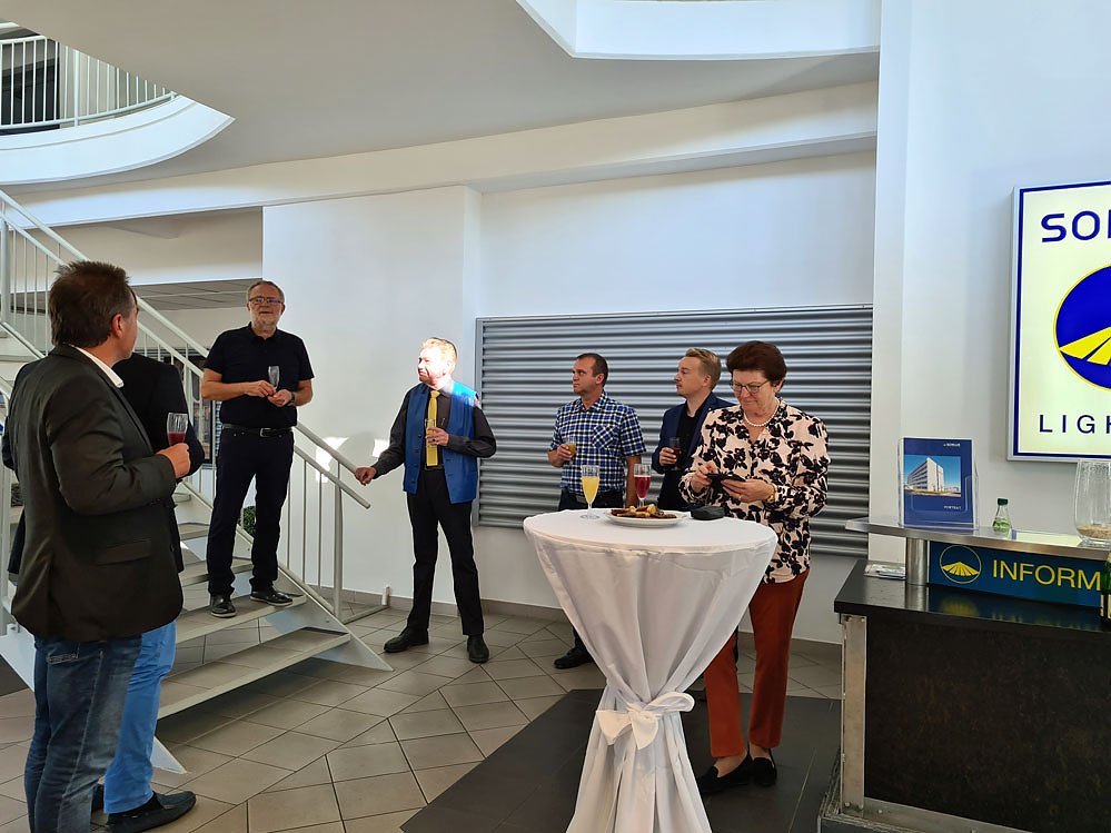 Nach der Begrüßung durch den ehemaligen Landrat Peter Hengstermann der sich bei der Familie Zimmermann und den Mitarbeiterinnen und Mitarbeitern der Firma SONLUX für die Möglichkeit, den Betrieb kennenzulernen bedankte, betonte MdL Stefan Schard, dass die Firma SONLUX die Elektroindustrie der Stadt Sondershausen maßgebend geprägt hat. SONLUX ist ein innovativer Familienbetrieb, der mit Leidenschaft geführt wird. Die Familie Zimmermann ist in Sondershausen nicht nur unternehmerisch tätig, sondern sie ist auch im kulturellen Bereich sehr aktiv.