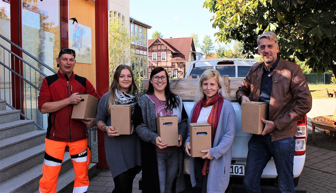 Tino Scharfe und Stephan Klante (rechts) überbrachten jetzt den Kindertagesstätten in Neustadt, Niedersachswerfen, Herrmannsacker und auch in Ilfeld den frisch zubereiteten Apfelsaft. Dort bedankten sich die Erzieherinnen Jessica Mischke und Wookie Schmidt sowie Leiterin Anna Müller (v.l.n.r.). (Foto: Kita Rappelkiste)