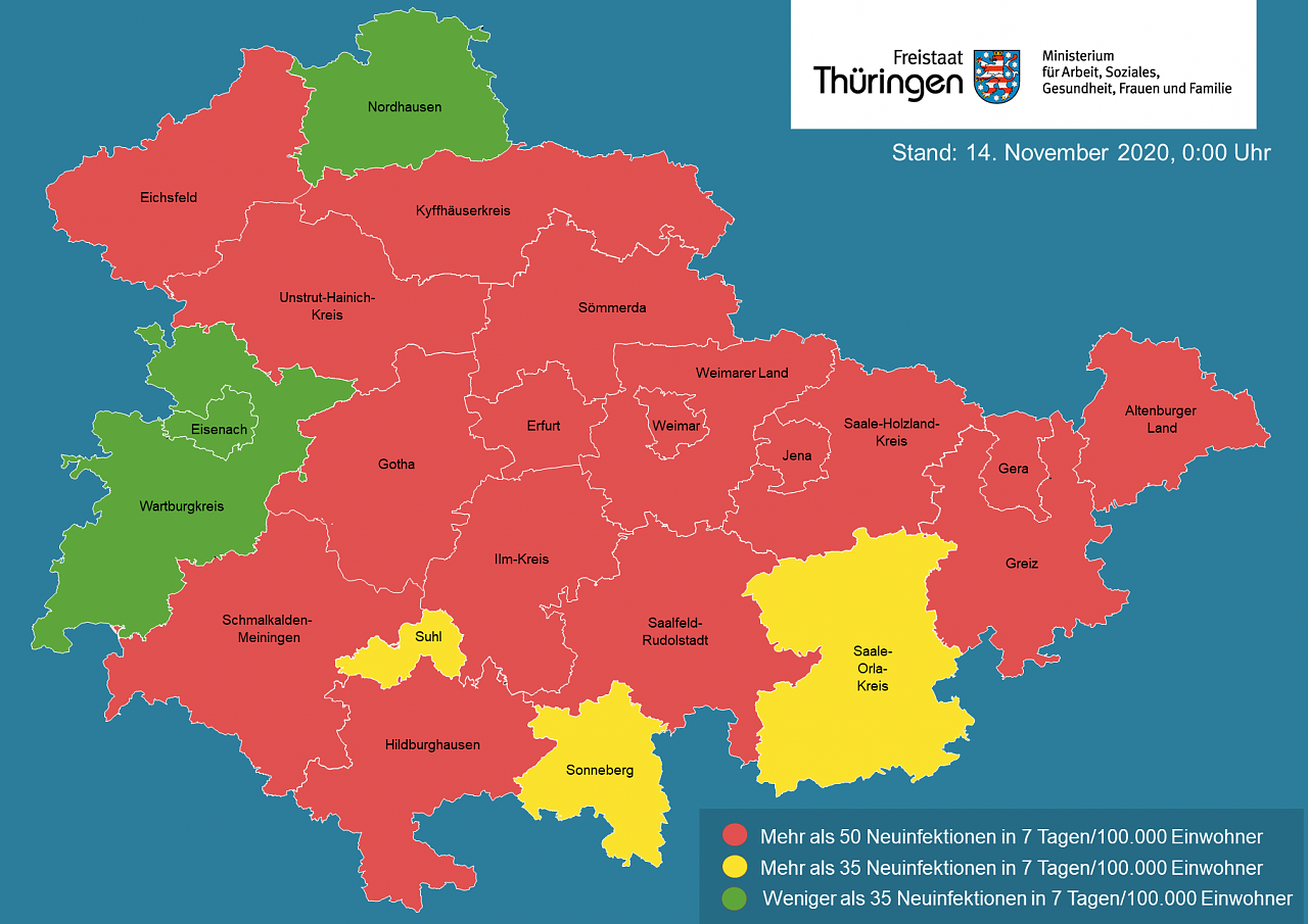 Am Montag wird in Berlin entschieden, welche Maßnahmen auf Bundesebene ab Dezember ergriffen werden, um die Krankheit zu stoppen. Es soll an dieser Stelle nicht spekuliert werden, wohin die Reise bis Weihnachten geht, aber wir geben Ihnen hier die aktuellen Fallzahlen weiter, die heute das für Gesundheit zuständige Thüringer Ministerium veröffentlichte.