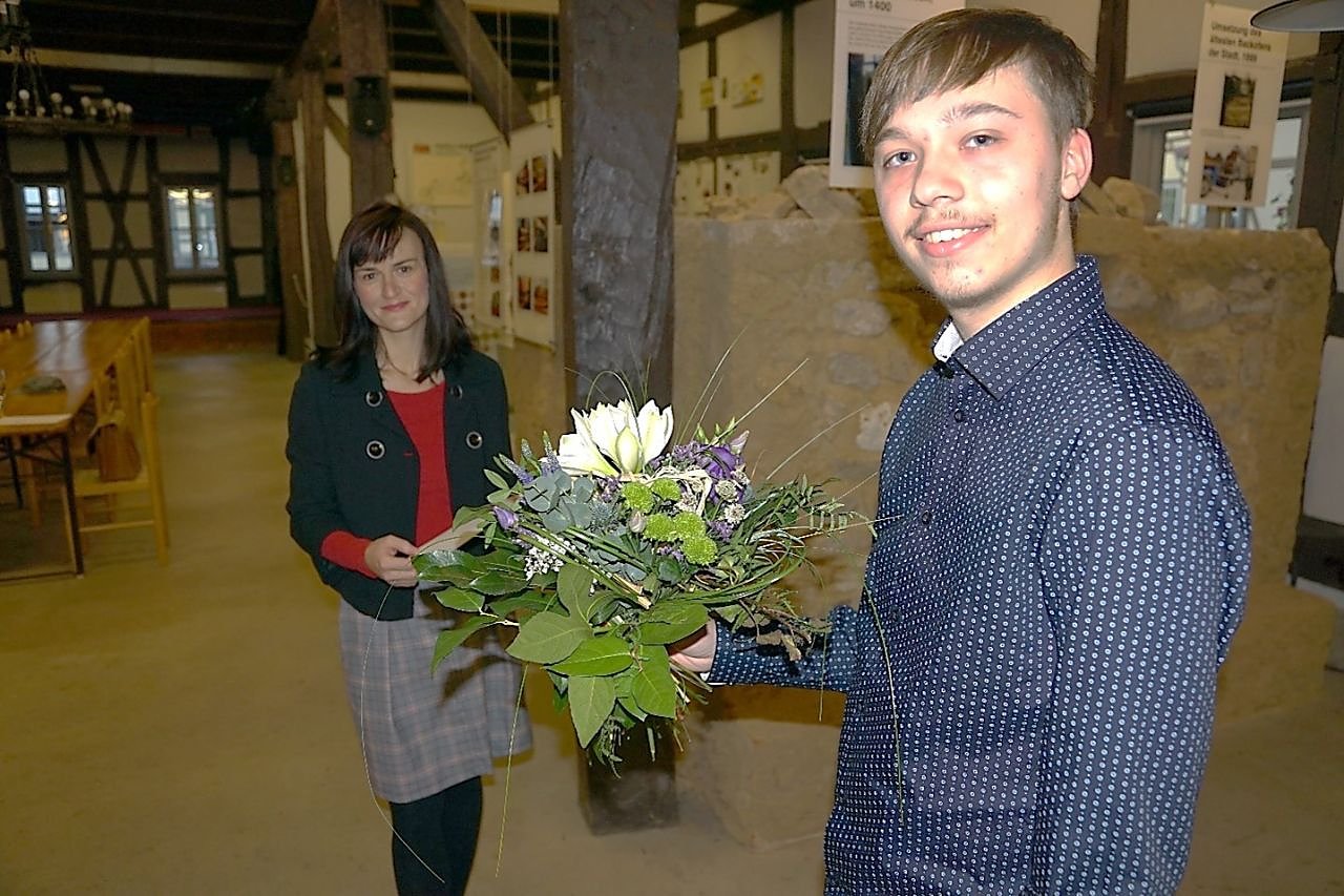 Am Mittwoch wurde ihm das Preisgeld mit Blumen im Tabakspeicher übergeben. Dabei ergab sich auch die Gelegenheit zu einem interessanten Austausch mit Hannes Angelstein, der über die Arbeit am Aufsatz sprach: Die Themenwahl ermöglichte mir vom Allgemeinen zum Einzelnen das Bürgertum und seine Anfänge in dieser Zeit in den Blick zunehmen. Es ist doch spannend, dass auch Nordhausen hier eine Rolle spielte. Jedoch darf man nicht von dem heutigen Verständnis über das Bürgertum ausgehen. In das Bürgertum im 14. Jahrhundert spielten viele uns heute nicht mehr gelebte Faktoren wie feudal-gesellschaftliche Strukturen, Normen und Werte des Mittelalters mithinein.
