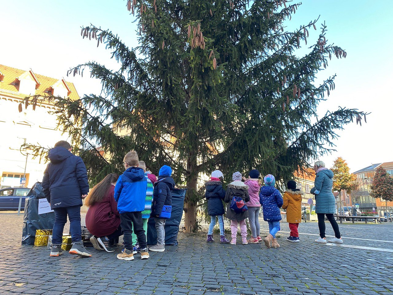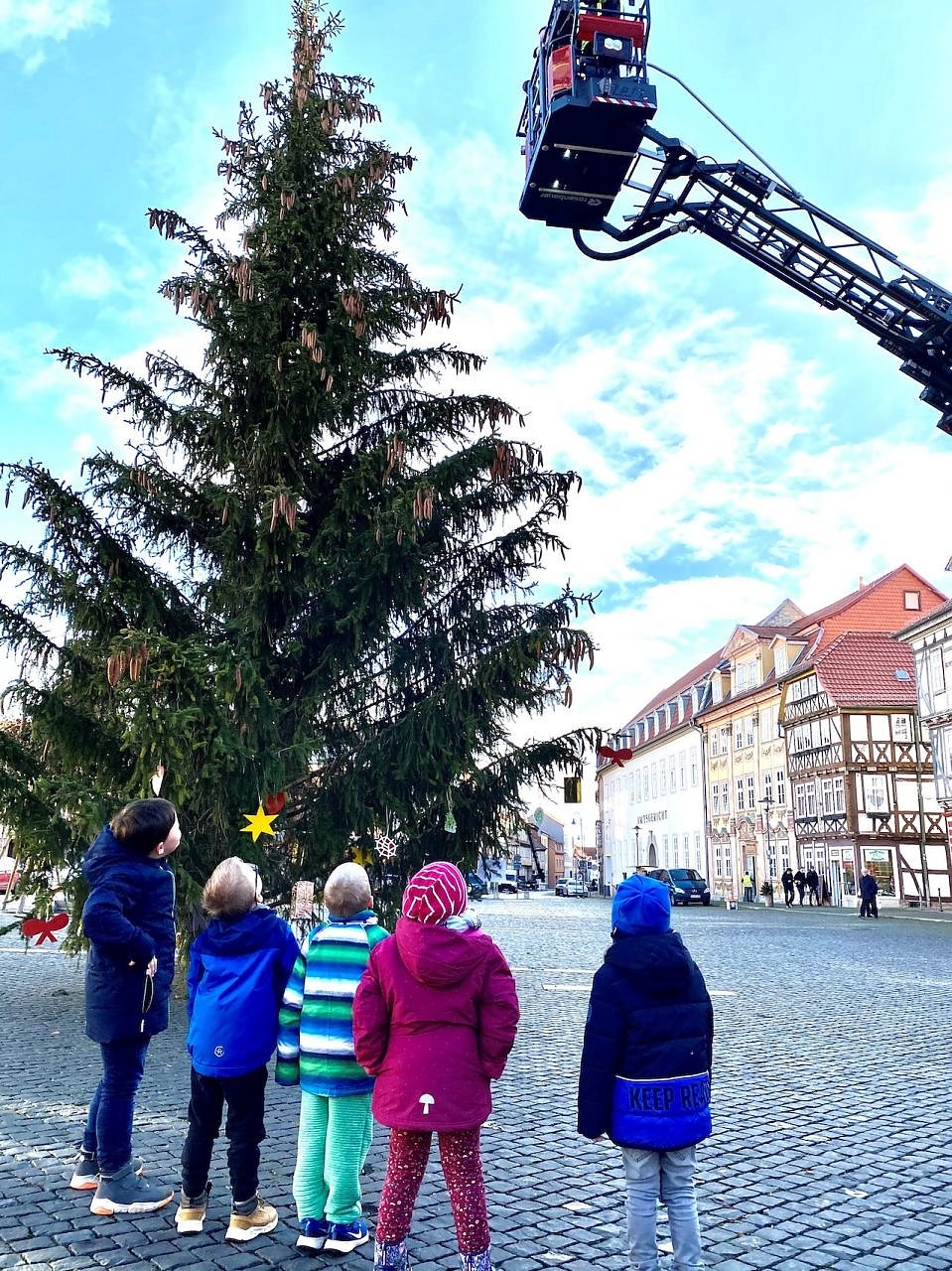 Los ging das große Schmücken am heutigen Montag am Untermarkt, wo die Mädchen und Jungen der Kitas des Priorats die rund zehn Meter Meter hohe Fichte verschönerten.