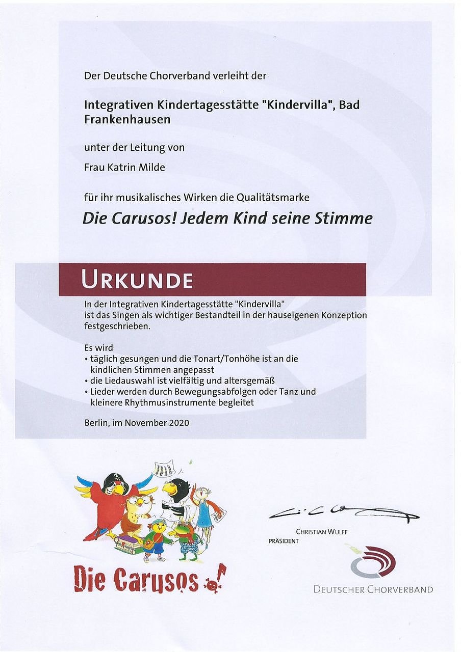 Seit 2010 besitzt die integrative Kindertagesstätte das musikalische Qualitätssiegel des Deutschen Chorverbandes Die Carusos und dieses wurde 2020 erneut verteidigt.