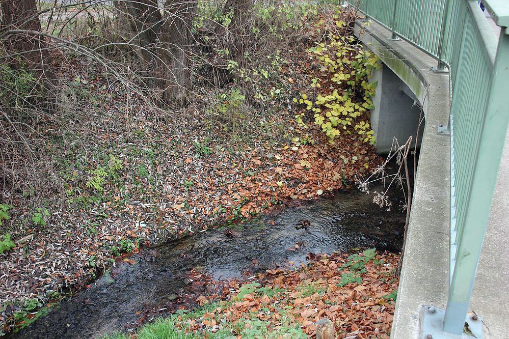 Hier tritt die Bebra unter dem Bahndamm der ehemaligen Bahnstrecke Bad Frankenhausen - Sondershausen Hauptbahnhof hervor.