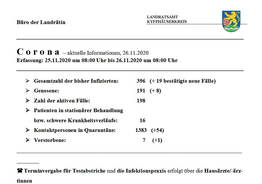 Derzeit werden im Kyffhäuserkreis 198 positiv SARS-CoV-2 getestete Personen (55 aus dem Altkreis Sondershausen und 143 aus dem Altkreis Artern) betreut.