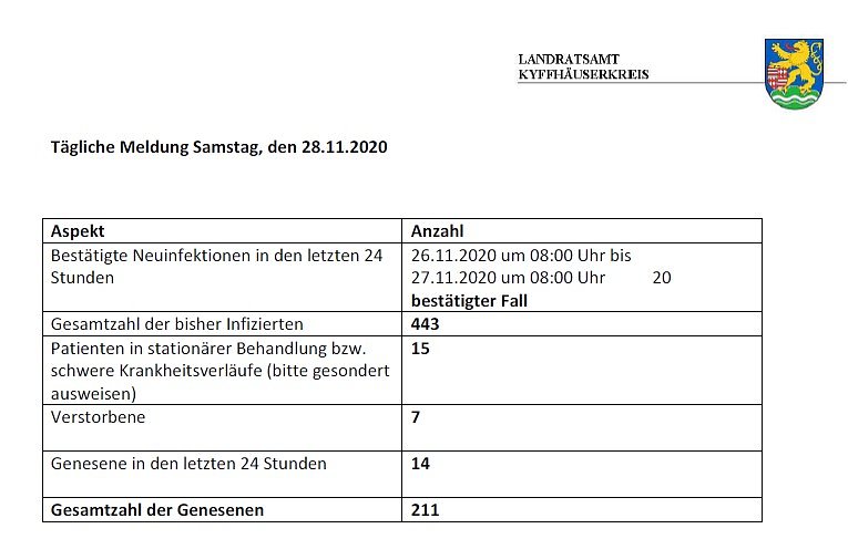 7 Tage Inzidenzwert Kyffhäuserkreis Stand 28.11.2020, 00:00 Uhr = 119,9 laut RKI