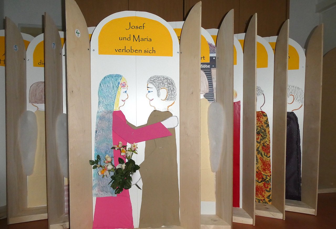 Die einzeln Fenster (1,30 x 0,60 m) zeigen die Weihnachtsgeschichte. Verschiedene biblische Zitate machen die tiefere Bedeutung von Jesu Geburt deutlich, erläutert der Pfarrer das Projekt. So bleibt der Kirchplatz trotz fehlendem Adventsmarkt kein leerer Platz. Und wenn die Menschen nur bedingt in die Kirche kommen können, dann "erzählen" wir ihnen eben vor der Kirche von Weihnachten, lädt die Gemeinde ein.