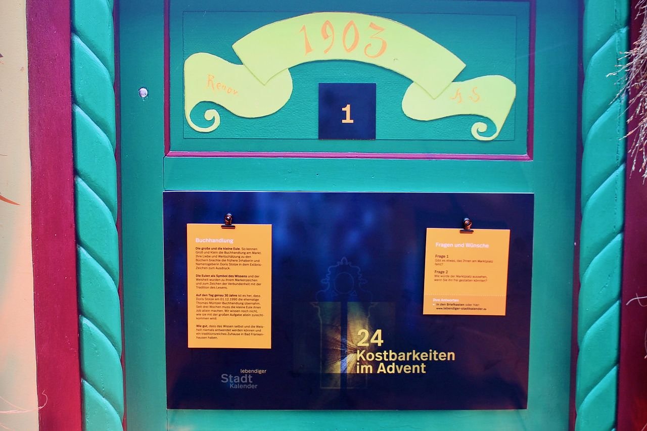 Wer sich für die Geschichte des jeweiligen Standortes interessiert, kann sie auf einem Aushang an der Adventstür nachlesen. Auf der zugehörigen Website www.lebendiger-stadtkalender.de wird ebenfalls ab dem 01.Dezember jeden Tag das aktuelle Türchen geöffnet.