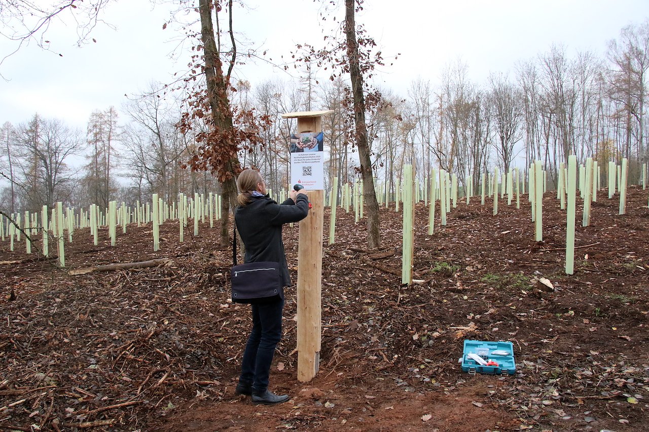 Als Nachhaltigkeitsoffensive bezeichneten die Sparkassenvorstände ihrer Aktion Ein Baum für jedes Girokonto, die von Anfang Juni bis Mitte November lief und gemeinsam mit dem städtischen Sachgebiet Umwelt und Grünordnung und Stadtförster Axel Axt nun in die Tat umgesetzt wurde. Insgesamt 700 Bäume konnten auf diesem Wege in die mit Mulch vorbehandelte Erde gesetzt werden. Wo einst Fichte an Fichte stand, wachsen heute Douglasie, Weißtanne und Kirsche friedlich nebeneinander. Mit Wuchshülsen sind sie vor Sonnenschäden und hungrigen Waldbewohnern geschützt. Diese Kunststoffhülsen sind mit knapp 8 Euro wesentlich teurer als die Setzlinge, die sie schützen. Können aber dafür auch deren Überleben absichern.