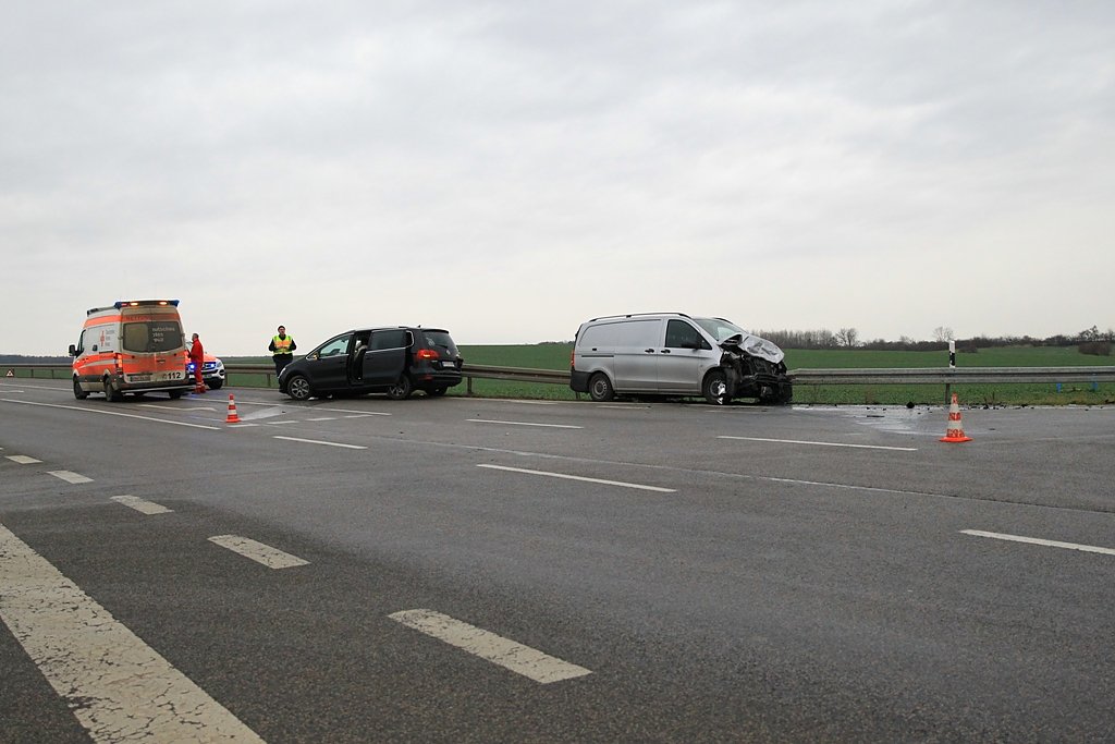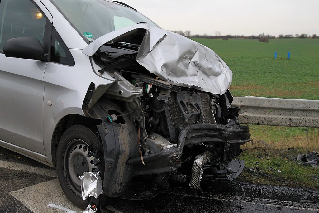 Im Kreuzungsbereich kam es dann zur Kollision, der Mercedes Transporter krachte in die Beifahrerseite des VW Sharan, drehte sich und schleuderte in die Leitplanke.