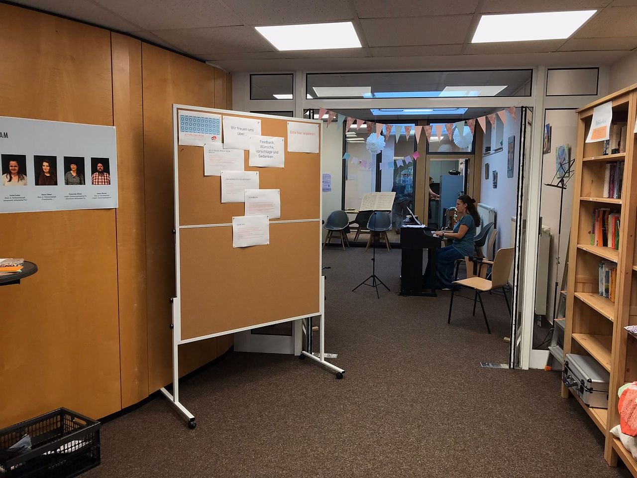 Und auch das Thema Nachhaltigkeit kommt in den Möglichkeitsräumen nicht zu kurz. Denn dort gibt es eine Tauschecke, wo jede / r etwas abgegeben kann, was sie / er nicht mehr braucht, was aber zu schade zum Wegwerfen ist. Statt dessen kann sie / er sich dann etwas anderes aus dem Tauschregal aussuchen und mitnehmen, was sie / er vielleicht gebrauchen kann. Doch das war noch nicht alles. Die Kreativgruppe Aus Alt macht neu die Franziska Weber leitet, haucht alten Stoffen neues Leben ein und so konnten die Besucher*innen heute u.a. selbstgenähte Kissen, Lavendelsäckchen, Sorgenfresserpüppchen oder Klammerschürzen gegen eine kleine Spende erwerben.