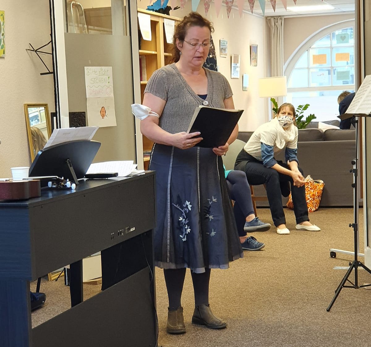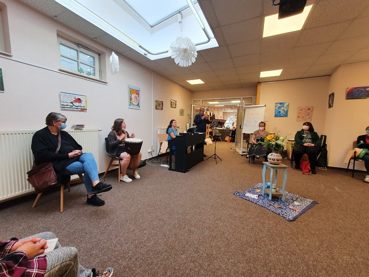 Für das leibliche Wohl wurde bestens gesorgt und auch die musikalische Unterhaltung durfte nicht fehlen. Stephan Piontek (Flöte) Luisa Lucas (Ukulele /Trommel / Klavier / Gesang) und Christiane Marx (Klavier / Geige) musizierten gemeinsam für die Gäste. Jedoch hatten auch diese die Gelegenheit, mit Rhythmusinstrumenten die Musiker zu begleiten und beim gemeinsam einstudierten Kanon mit einzustimmen. Besonders berührend war das selbst komponierte und vorgetragene Lied von Luisa Lucas, bei dem sie sich selbst am Klavier begleitete. Gefühlvolle Klänge die unter die Haut gehen.