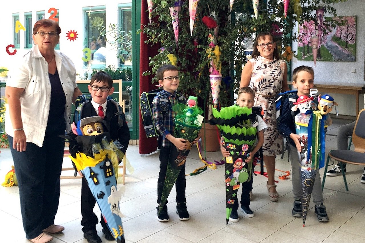 Ein großer Tag war es für Ayvaz, Paul, Robin und Tayler. Mit ihren bunt geschmückten Zuckertüten standen sie erwartungsvoll vor ihren neuen Klassenlehrerinnen Frau Scharschuch und Frau Rassbachin und würden herzlich begrüßt.