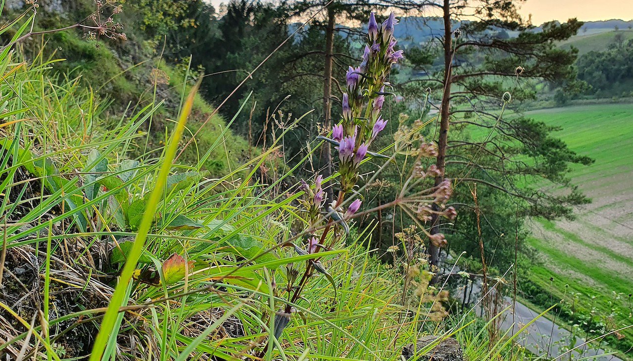 Einige wenige Arten scheinen angesichts langer Dürreperioden jedoch selbst bei optimaler Bewirtschaftug zurückzugehen. Da wir sehr selektiv bewirtschaften, kennzeichneten wir zum Beispiel blühende Exemplare des Deutschen Enzians (Gentianella germanica) vor der Mahd, so dass diese nicht abgemäht wurden und zur Samenbildung übergehen können.