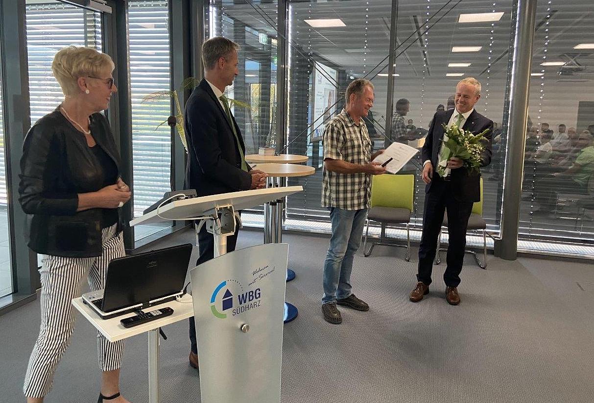 Zum Abschluss der Vertreterversammlung wurde mit Detlef Helbing ein langjähriger Mitarbeiter der WBG Südharz und gewählter Vertreter geehrt. Mehr als 40 Jahre war er Mitarbeiter in verschiedenen Positionen der Genossenschaft und in den vergangenen Jahren Teamleiter der WBG-Objektmanager.