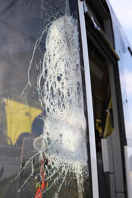 Dort kollidierte er mit einem Schulbus. Der 52-jährige Busfahrer und ein Kind wurden leicht verletzt. Herumfliegende Trümmerteile beschädigten weitere Fahrzeuge.