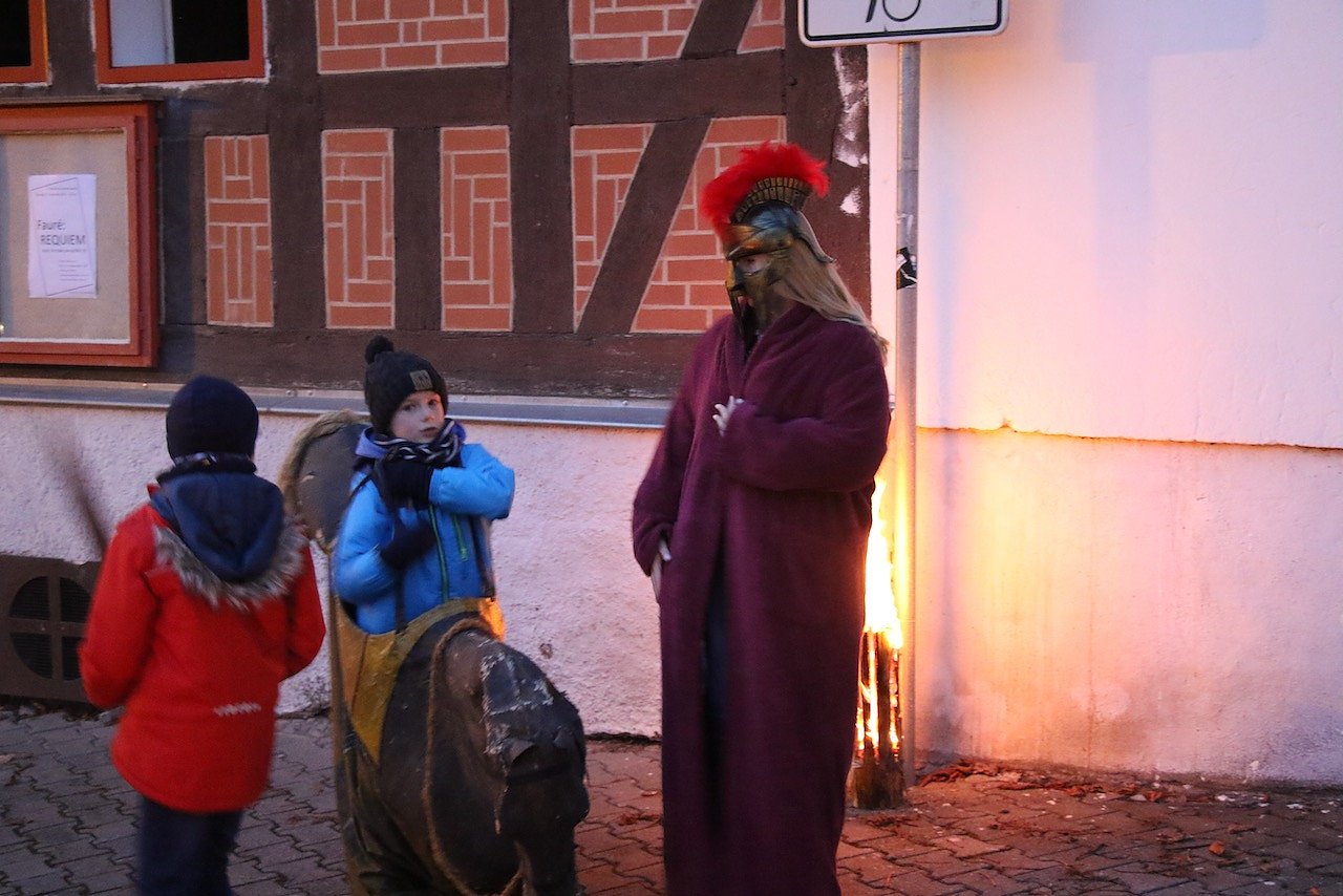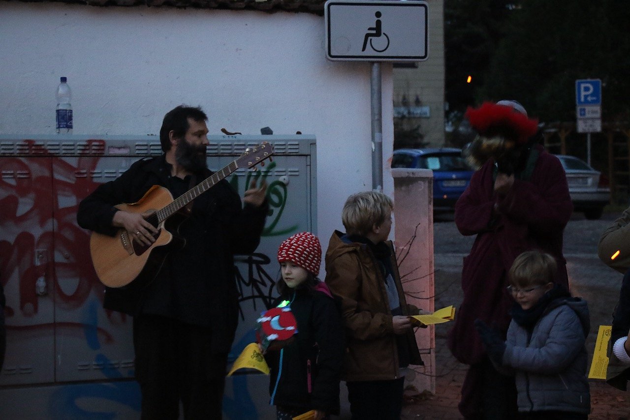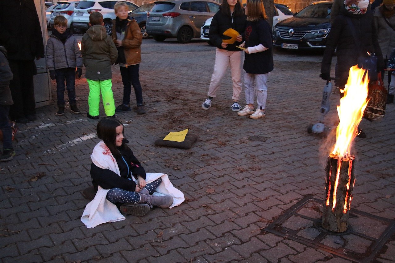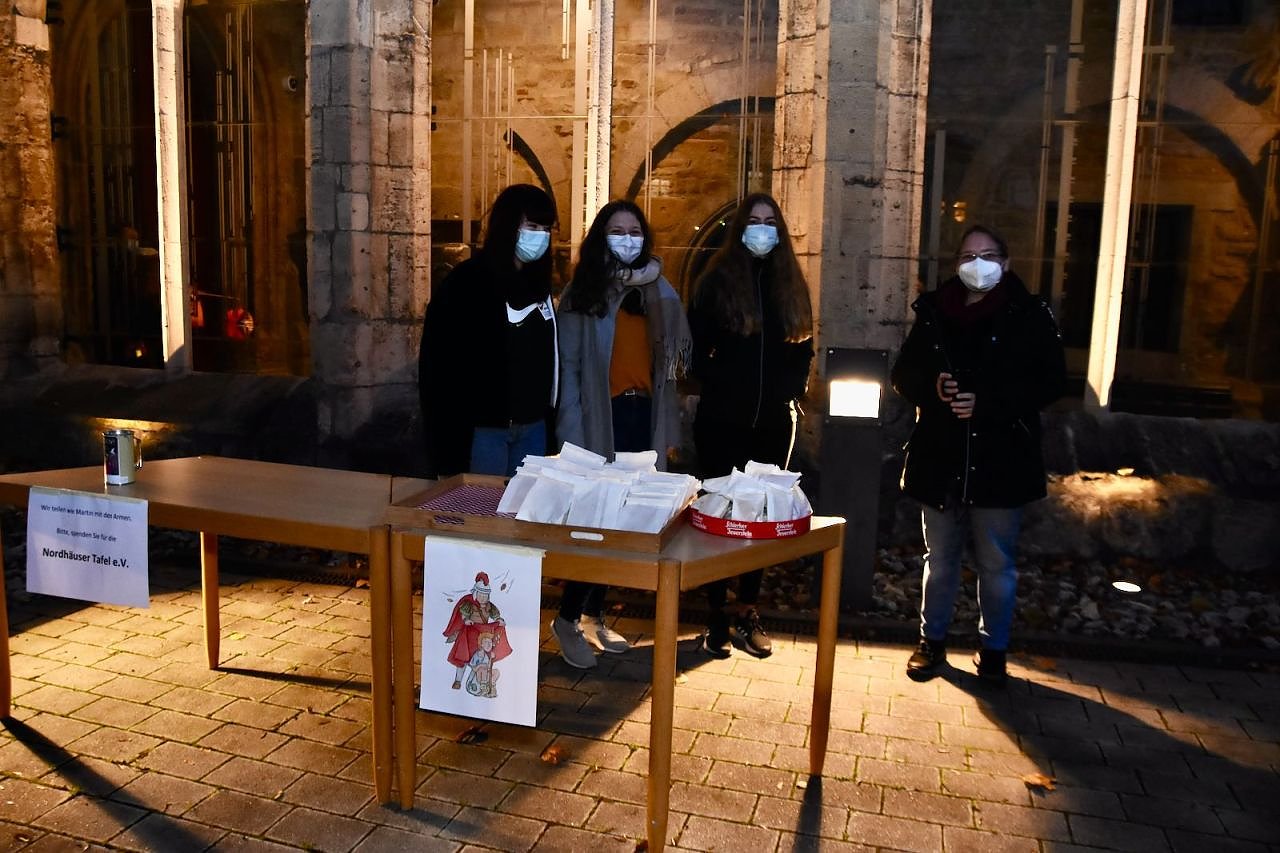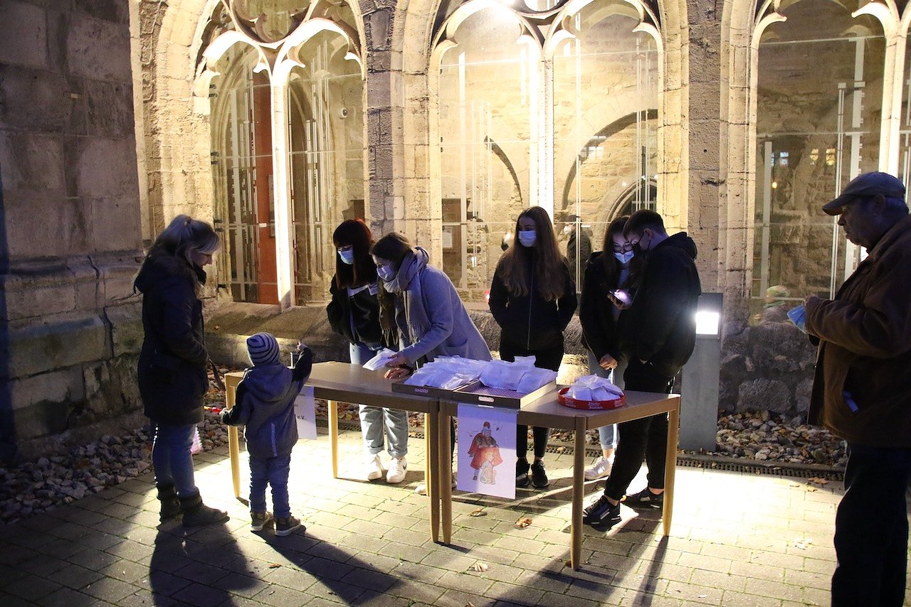 Vor dem katholischen Gotteshaus wurden die traditionellen Martinsbrezeln geteilt, mit Abstand und Mundschutz. Auf dem Platz vor der Blasii-Kirche zeigte man die Geschichte der beiden Martins, also die des Heiligen und die des Reformators, als kleinen Zeichentrickfilm. Die Teilung des Mantels wurde, mit musikalischer Begleitung, am Rande des Platzes vom Kinderkirchenladen in wechselnder Besetzung durchgespielt.