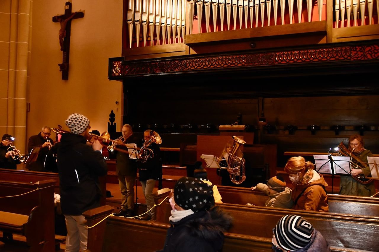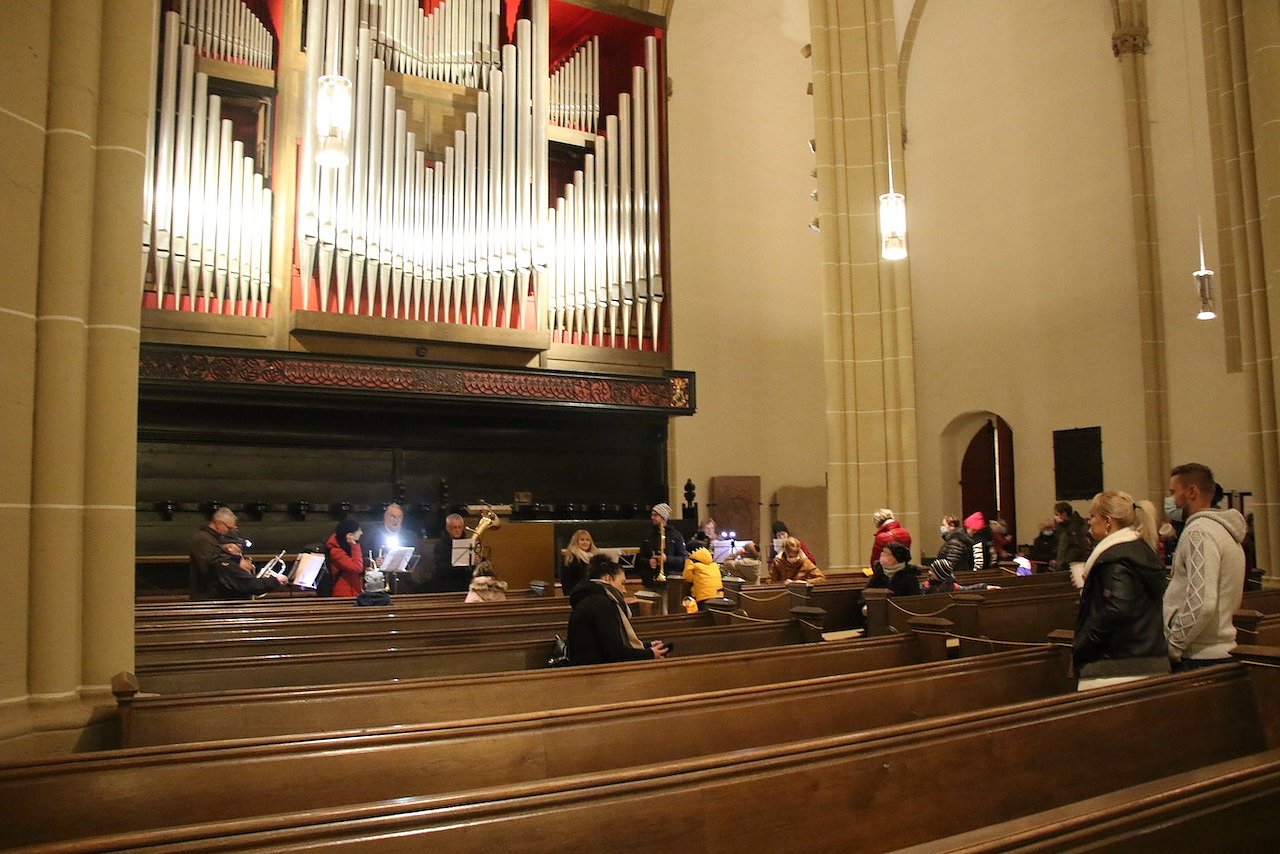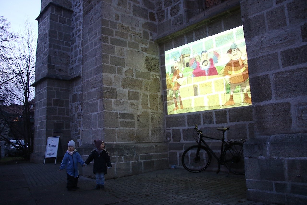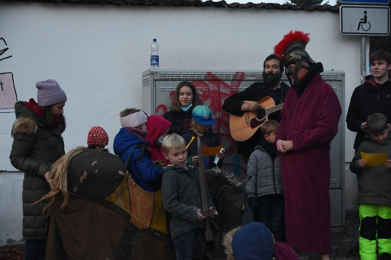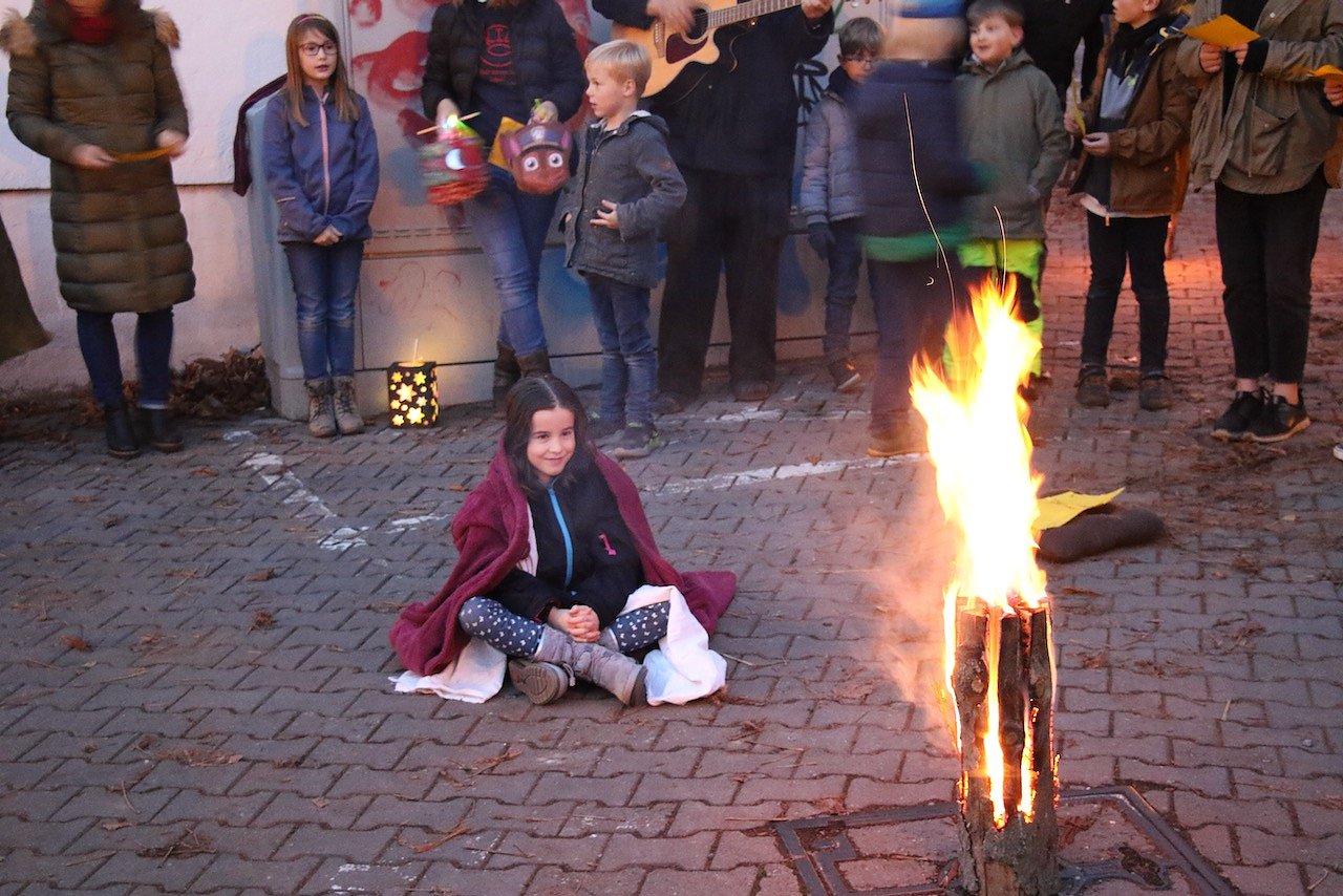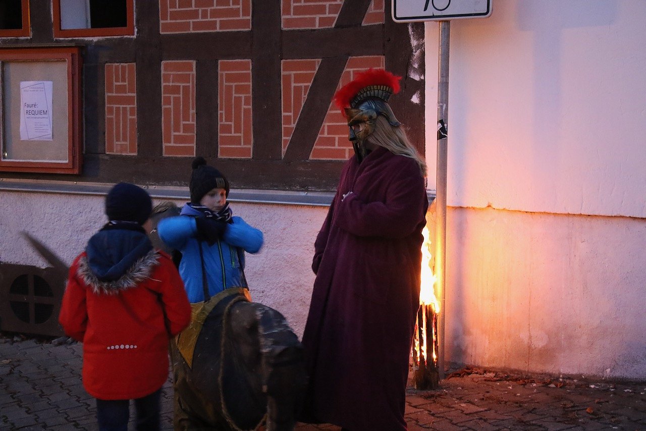 Vor dem katholischen Gotteshaus wurden die traditionellen Martinsbrezeln geteilt, mit Abstand und Mundschutz. Auf dem Platz vor der Blasii-Kirche zeigte man die Geschichte der beiden Martins, also die des Heiligen und die des Reformators, als kleinen Zeichentrickfilm. Die Teilung des Mantels wurde, mit musikalischer Begleitung, am Rande des Platzes vom Kinderkirchenladen in wechselnder Besetzung durchgespielt.