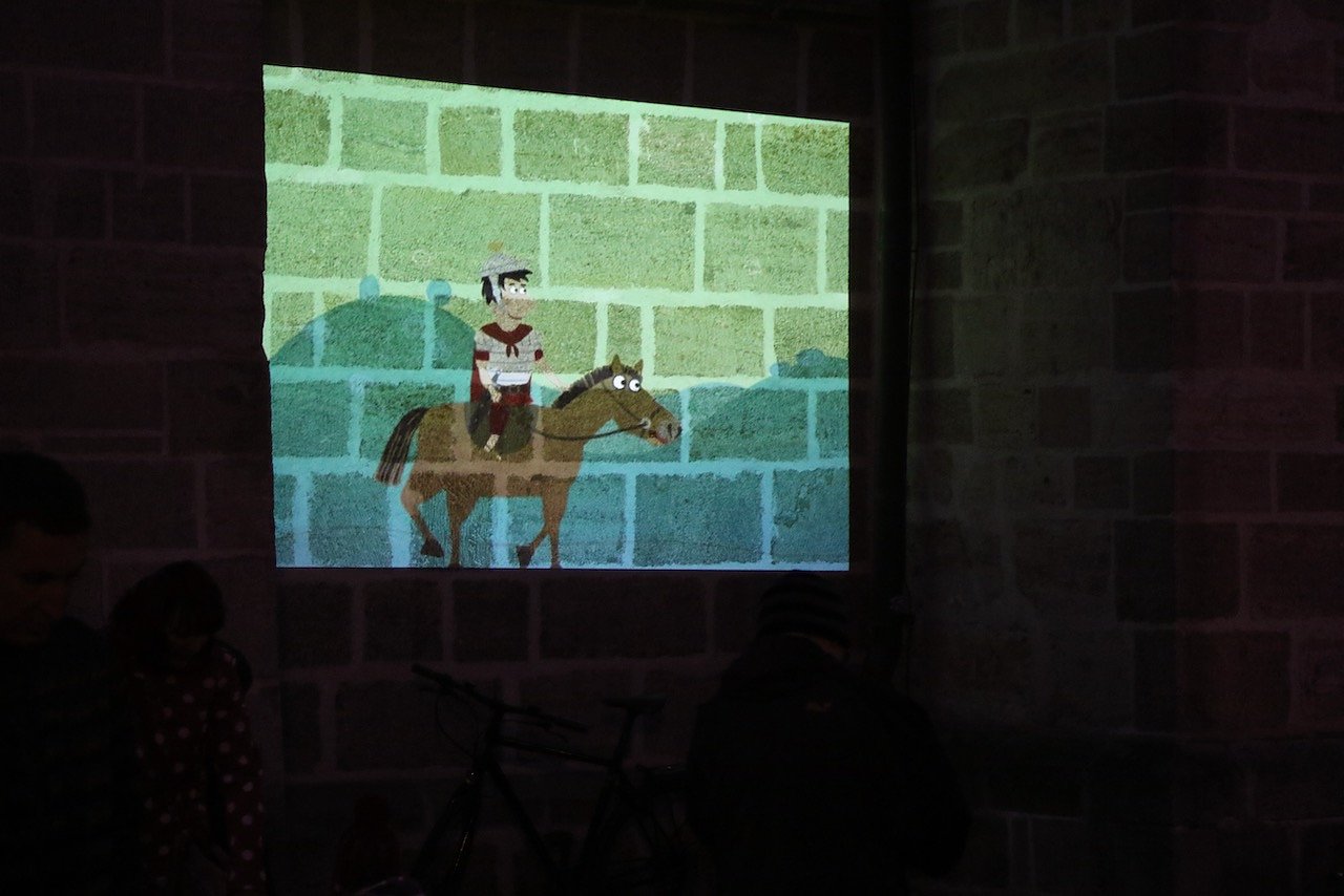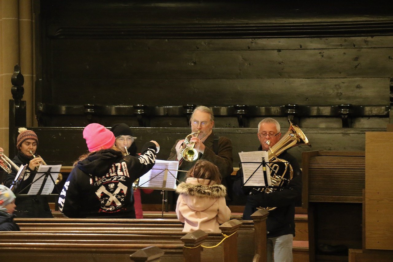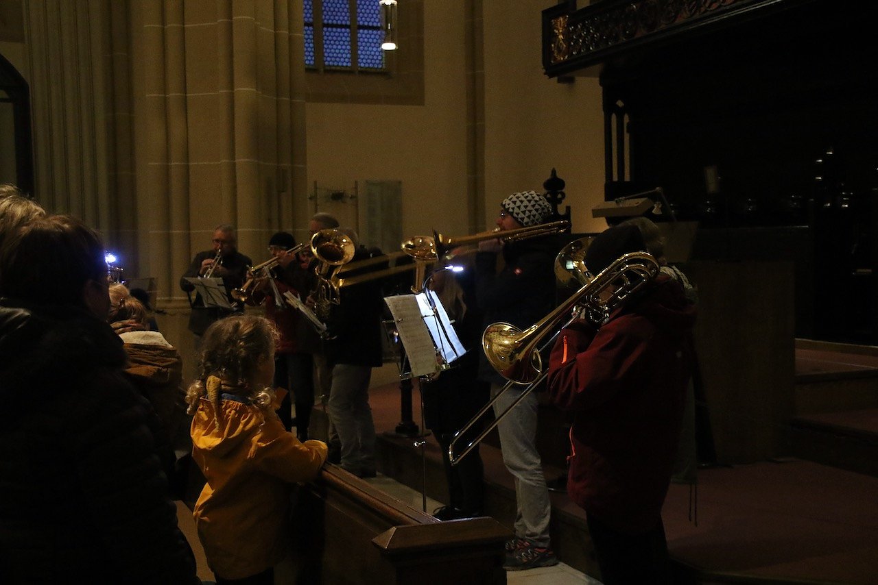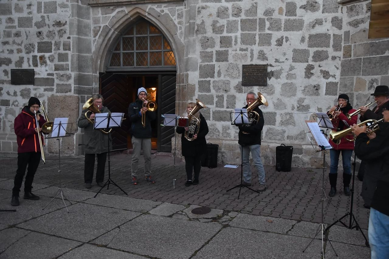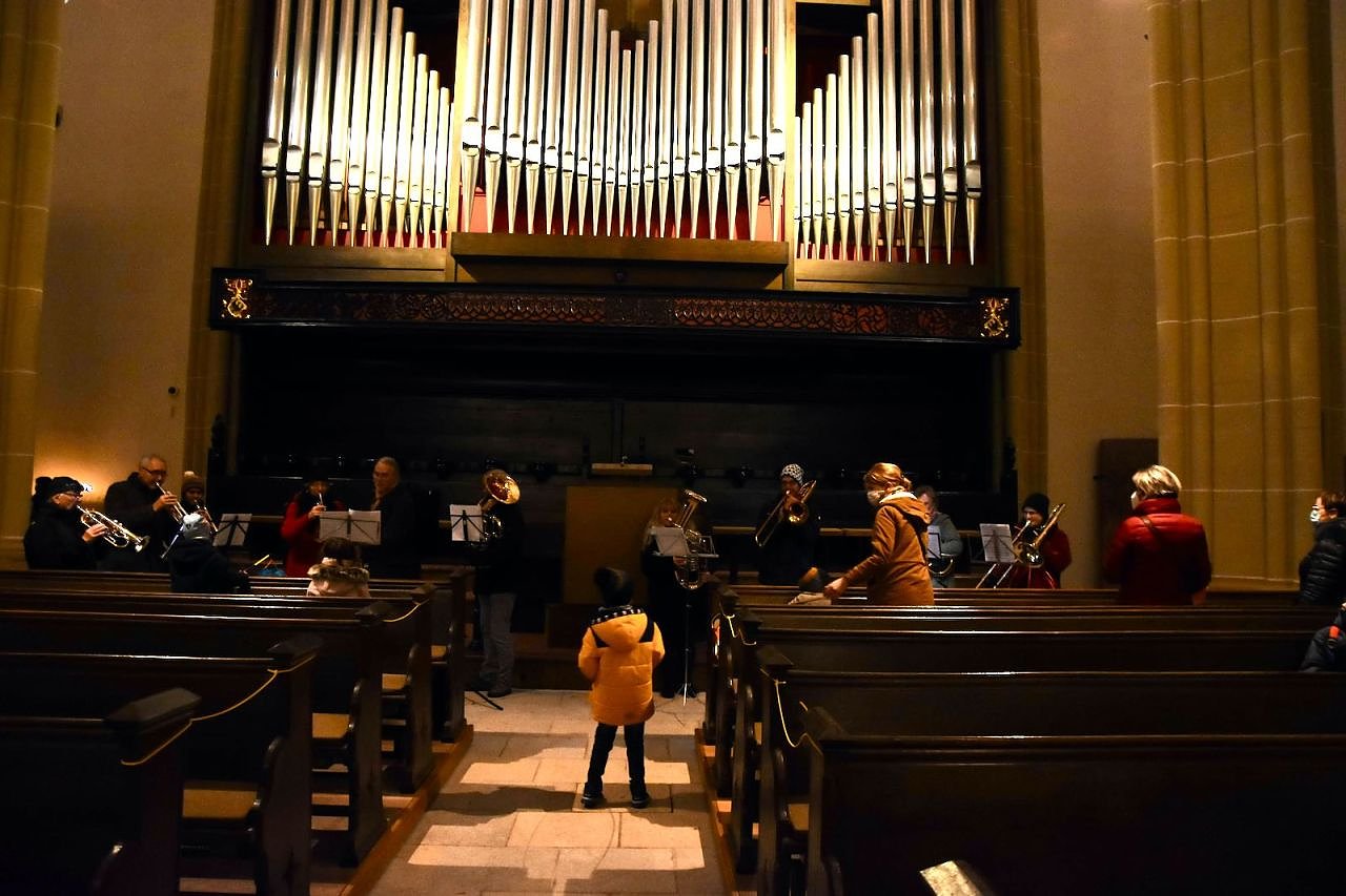 Vor dem katholischen Gotteshaus wurden die traditionellen Martinsbrezeln geteilt, mit Abstand und Mundschutz. Auf dem Platz vor der Blasii-Kirche zeigte man die Geschichte der beiden Martins, also die des Heiligen und die des Reformators, als kleinen Zeichentrickfilm. Die Teilung des Mantels wurde, mit musikalischer Begleitung, am Rande des Platzes vom Kinderkirchenladen in wechselnder Besetzung durchgespielt.