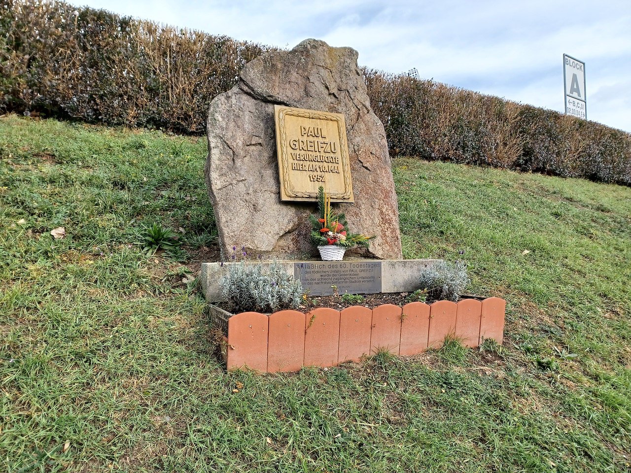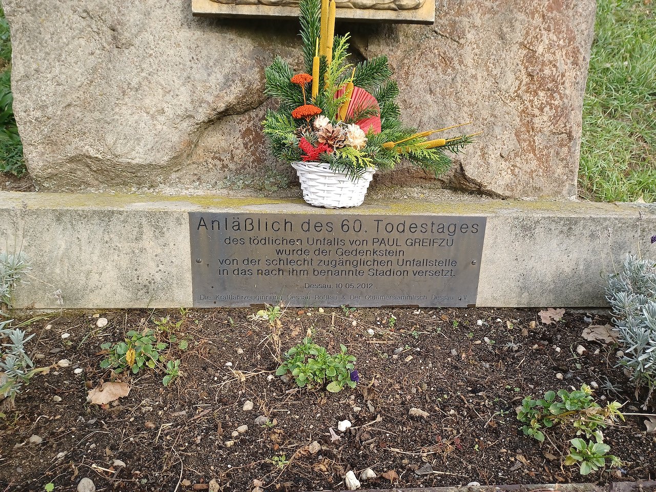 Ein weiterer Besuchsort an diesem Tag galt deshalb dem ehemaligen Automobilrennsport. Der Innungsobermeister Klaus Lothar Bebber, der über ein ausgezeichnetes geschichtliches Wissen seiner Stadt verfügt, führte die angereisten Klubmitglieder zu dem Gedenkstein für den ehemaligen Thüringer Rennfahrer, Paul Greifzu. Der Rennfahrer starb bei einem Trainingslauf in seinem Rennwagen auf der Dessauer Autobahn am 10. Mai 1952 nach der Explosion des Rennmotors. An dem Gedenkstein, der sich heute auf dem Gelände des gleichnamigen Sportstadiums befindet, legten die anwesenden ehemaligen Rennfahrer aus dem Südharz Martin Bohnhardt (Motorcross), Peter Süssemilch (Rundstrecke auf P 601) und Lutz Pfeil (Bergrennen) ein Blumengebinde zu Ehren des verunglückten Motorsportlers aus Thüringen nieder.