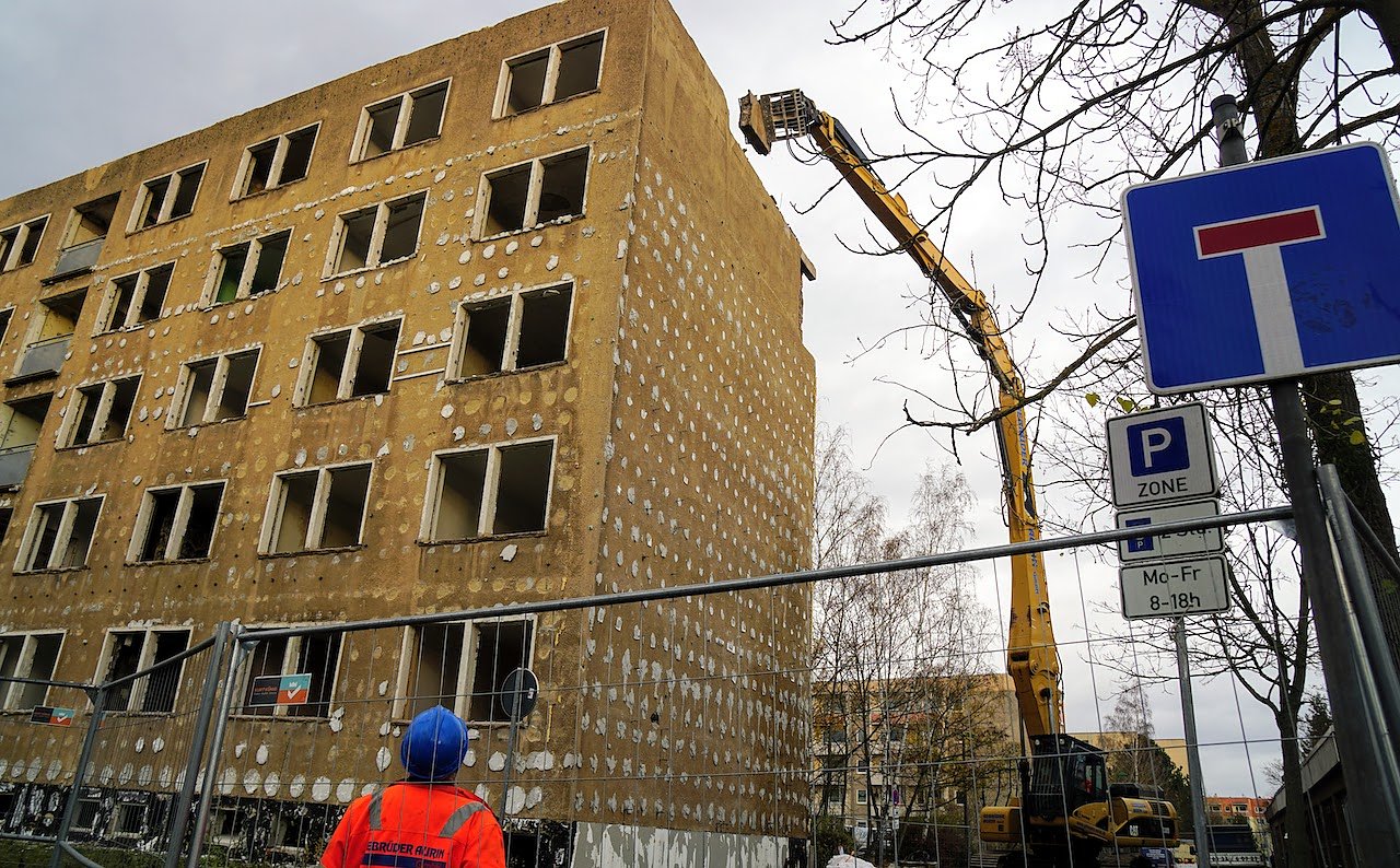 Der Rückbau der 52 Jahre alten DDR-Platte ist Teil des klimagerechten Quartiersumbaus im Ossietzky-Hof. Der ursprüngliche Plan, die Ein-Raum-Wohnungen in dem Schwesternwohnheim zu größeren Wohnungen umzubauen, musste aus Kostengründen verworfen werden.
