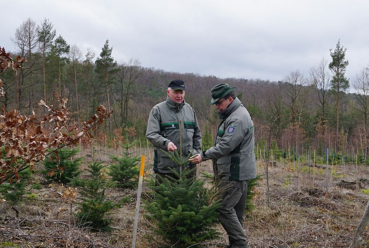 lli Klüßendorf (Forstamt Sondershausen) und Dr. Horst Sproßmann (ThüringenForst-Zentrale) prüfen die Vitalität der Klimabaumarten (Foto: ThüringenForst, Dr. Horst Sproßmann)