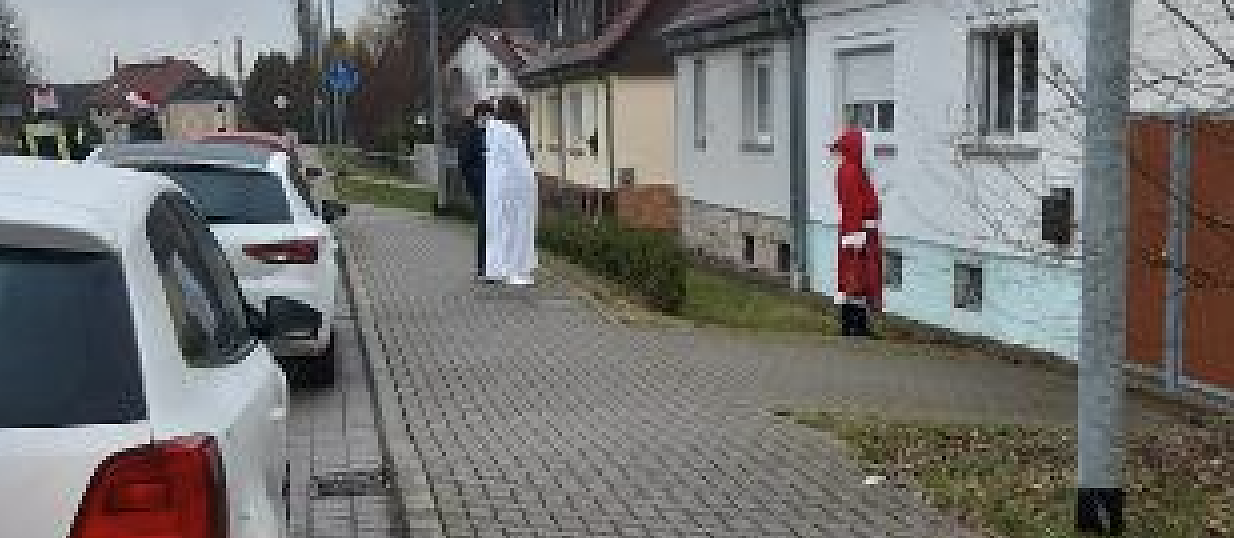 Ein Weihnachtsmann, begleitet von seinem Engel, einem Feuerwehrauto samt Besatzung. Sie fuhren von Haus zu Haus und verteilten kleine Geschenke, falls ich das richtig gesehen habe.