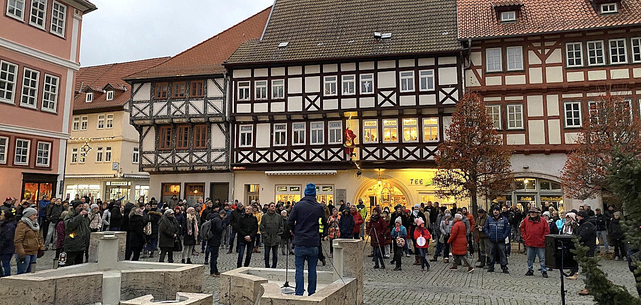 Wie an jedem Adventsonntag fanden sich auch heute wieder etwa 250 Menschen vor der Marktkirche in Bad Langensalza ein, um gegen die Einschränkungen der Landesregierung im Zuge der Coronamaßnahmen zu demonstrieren. Und wie bereits am letzten Sonntag zogen sie nicht mehr spazierend durch die Stadt, sondern verharrten eine Stunde lang in kleinen Gruppen bei Glühwein oder Kaffee und lauschten den Rednern bzw. der abgespielten Weihnachtsmusik.