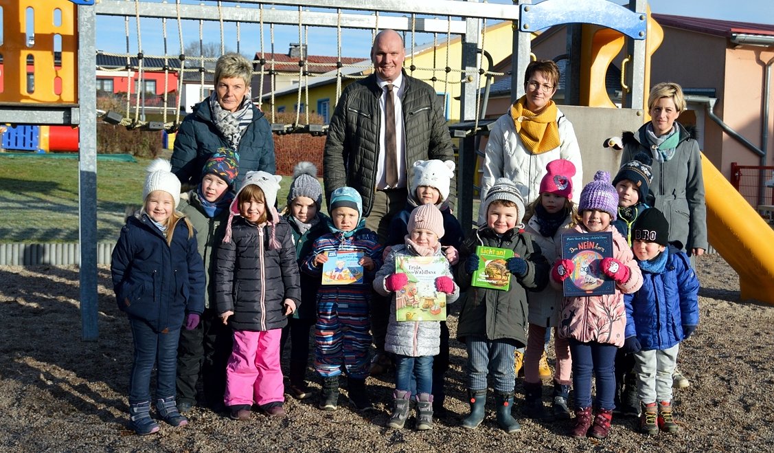 Bürgermeister Steffen Grimm übergibt Geschenke an die Kinder der Kindertagesstätte Dorfspatzen in Hohenebra. (Foto: P.Zoch)