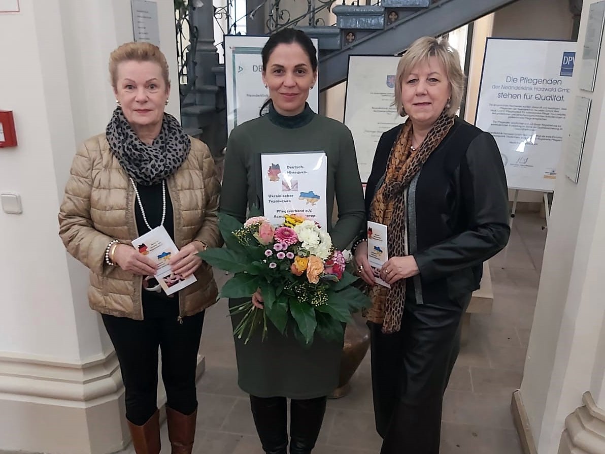 Tetiana Briuzghina erhielt jetzt den Status als Gesundheits- und Krankenpflegerin nach einer Anerkennungsprüfung im Landesverwaltungsamt Weimar und ist nun in Thüringen in einem Seniorenpflegebereich tätig. Wir freuen uns sehr, mit Frau Briuzghina eine internationale Unterstützung als Pflegefachkraft zu erhalten. Als Vorstand des Deutsch Ukrainischen Pflegeverbandes e.V. unterstützen wir die Aktivitäten in den Ländern diesbezüglich.