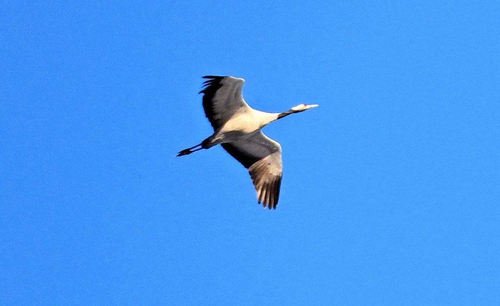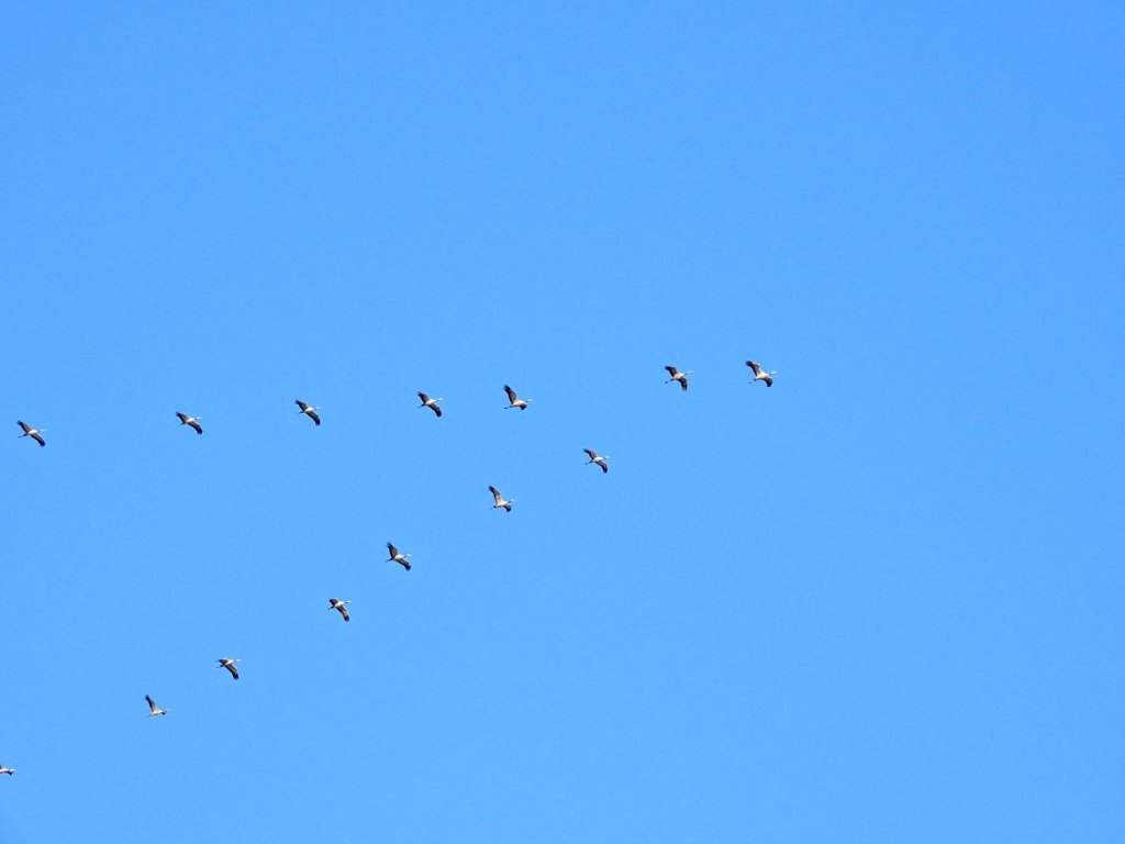 Es gab natürlich auch schöne Seiten des gestrigen Tages. Bei einem Winterspaziergang zum Rosenteich hörte ich bekannte Geräusche. Ein Blick nach oben und da flogen die Kraniche in wärmere Gefilde.