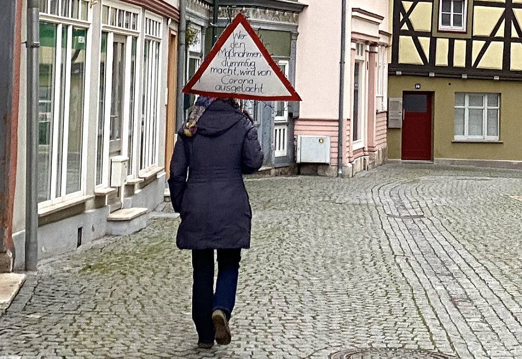 Alle, die sich hier treffen, sind sich in ihrer Bewertung der politischen Lage und der gesellschaftlichen Situation weitgehend einig. Wer anderer Meinung ist, wird am Sonntagnachmittag nicht auf den Platz kommen. Von den einstigen Gegendemonstranten hinter dem Rathaus fehlte auch heute jede Spur. Für die ebenfalls immer weniger werdenden Polizisten, die den Aufmarsch bewachen sollen, war es erneut eine ruhiger Dienst. Keine Vorfälle, keine Verstöße gegen die Regeln, von denen besonders die Abstandsregel von 1,5 Metern gut eingehalten werden konnte. Ein Nachmessen wie gestern in Frankfurt/M., wo Polizisten mit Zollstöcken zwischen den Spaziergängern herumliefen und die Abstände überprüften, war in Bad Langensalza nicht nötig.